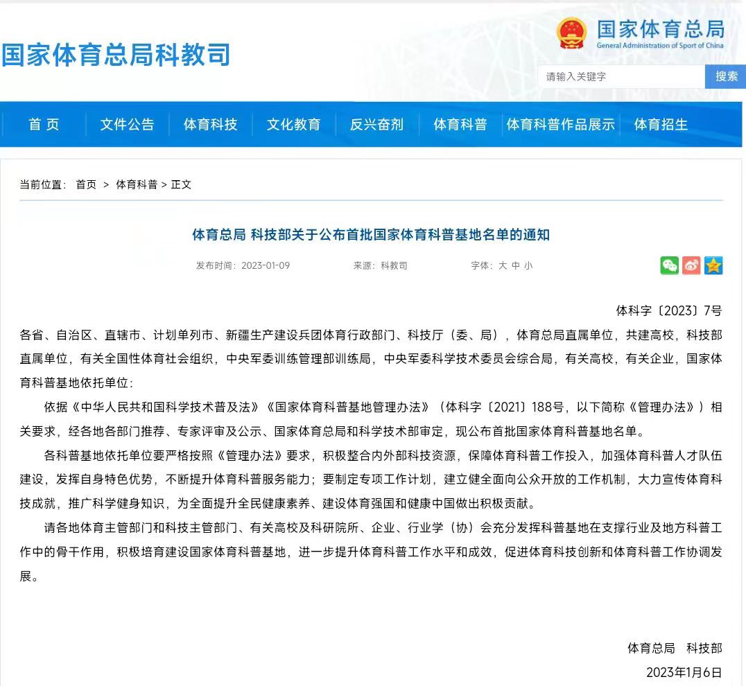 首批国家体育科普基地名单是依据《中华人民共和国科学技术普及法》《国家体育科普基地管理办法》(体科字〔2021〕188号)相关要求,经各地各部门推荐、专家评审及公示、国家体育总局和科学技术部审定后出台的。全国共有58个科普基地入选,申报类型分为“场馆类”和“其他类”,澳门十大信誉网赌大全体育与健康促进科普基地入选“其他类”。