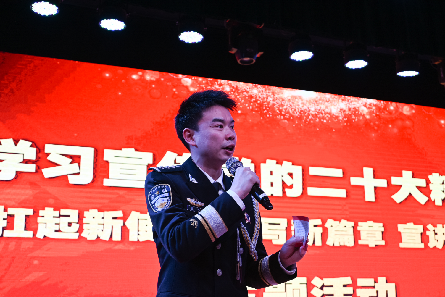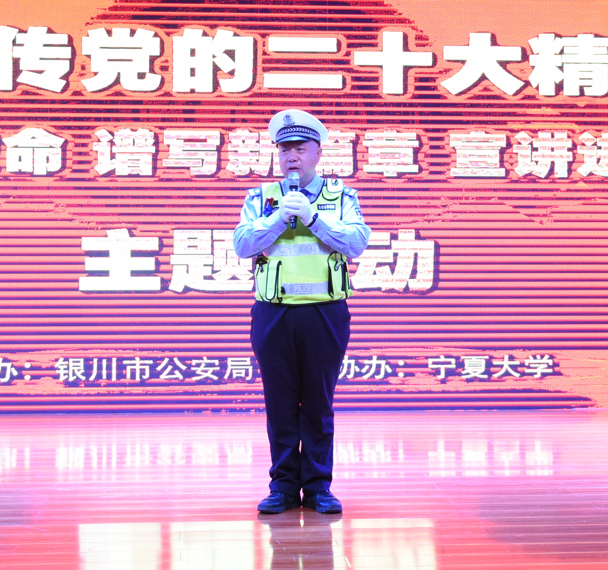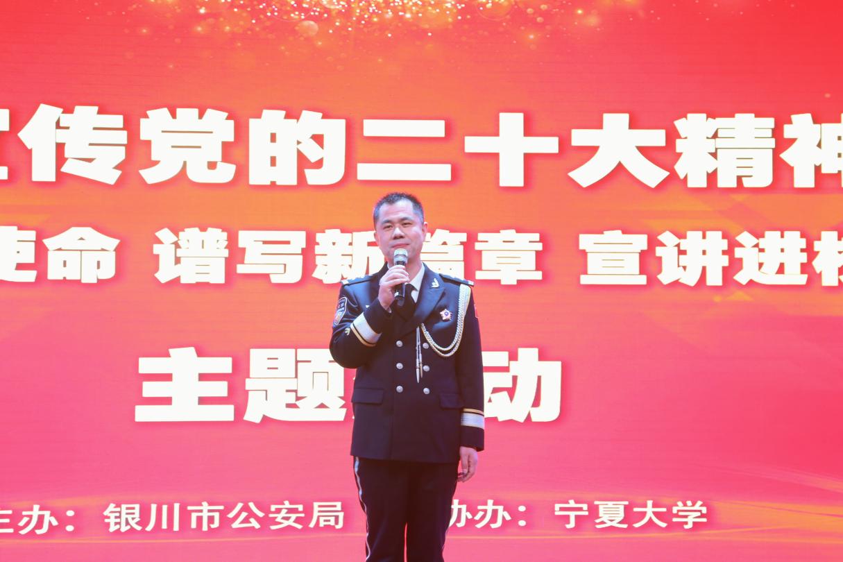永宁县公安局民警邹鑫君,“全国特级优秀人民警察”、银川市公安局刑侦支队刑事技术大队副大队长拜永强,银川市公安局刑侦支队民警杨超,全国公安系统二级英雄模范、全国特级优秀人民警察、银川市公安局交警分局四级高级警长杨鸿胜,永宁县公安局闽宁镇派出所民警刘艳分别围绕人民警察的家国情怀和成长经历、在刑侦岗位上守护公平正义、防电信网络诈骗、交通安全知识普及、闽宁镇原隆村警务室服务群众故事等主题,用精彩的宣讲充分诠释了新时代人民警察护航新征程、建功新时代的奉献精神和优良风貌。