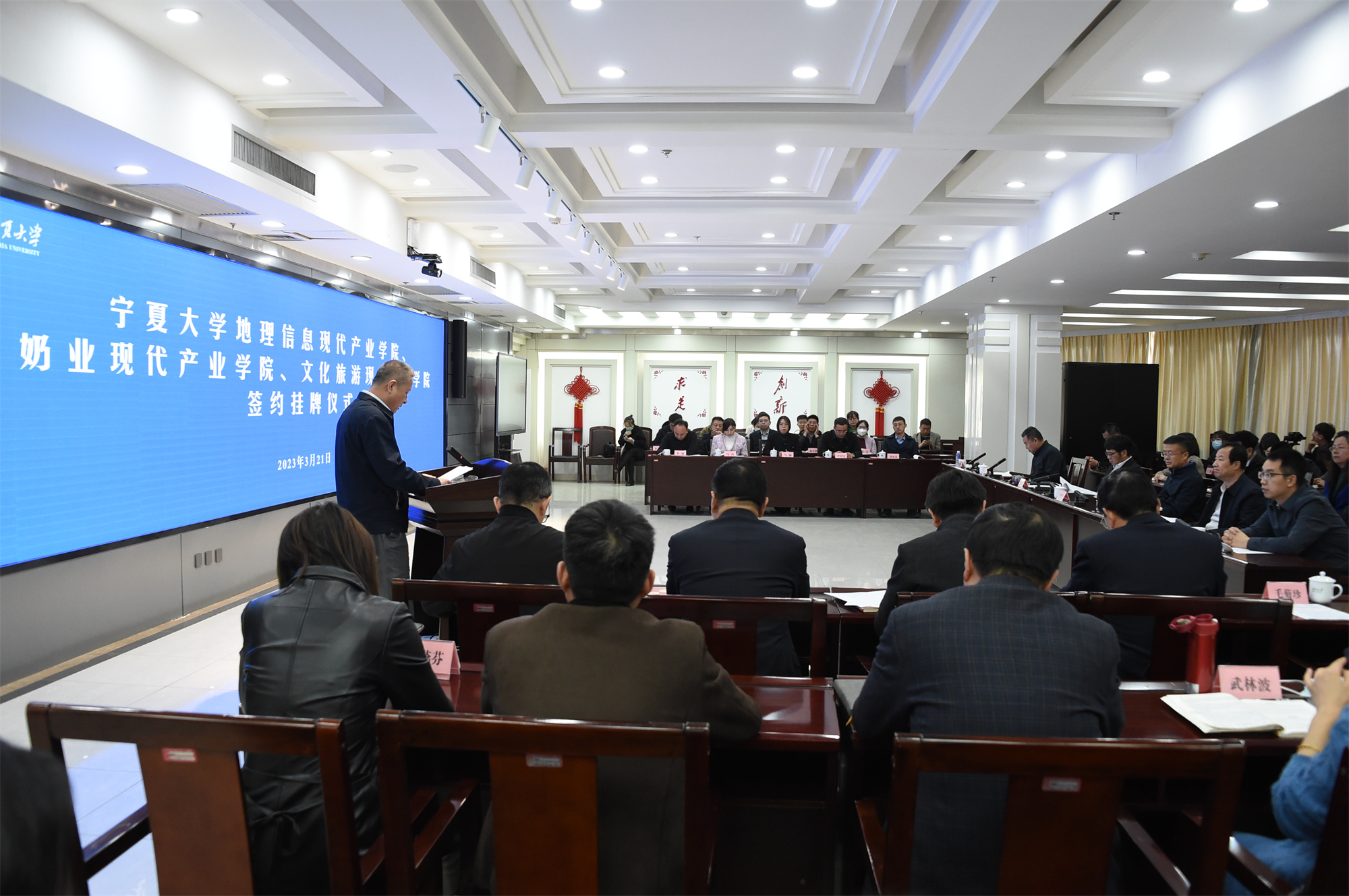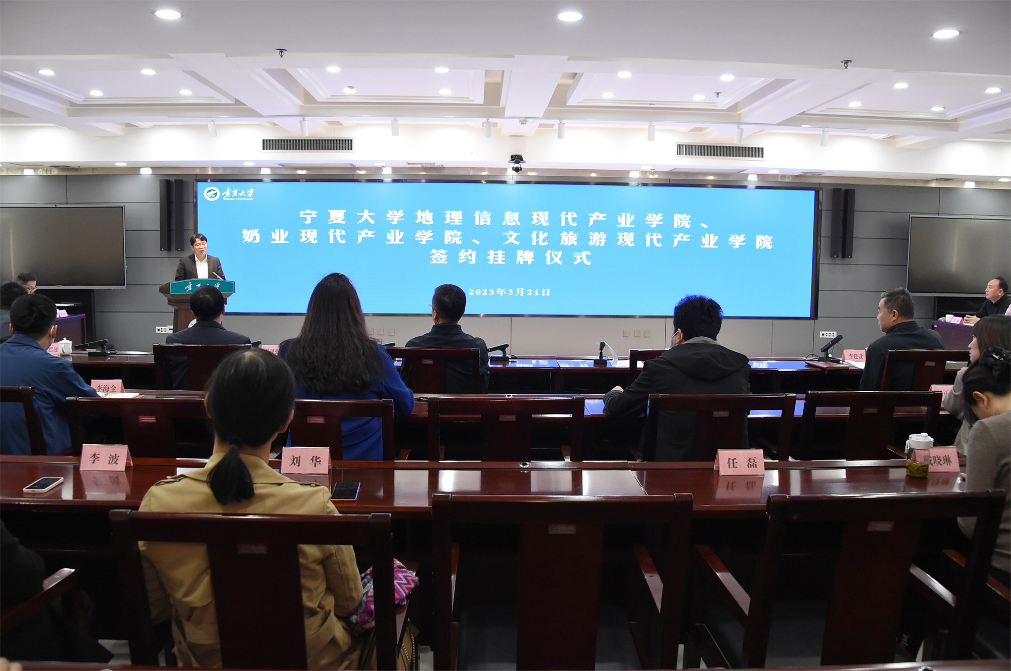 【澳门十大信誉网赌大全新闻中心讯 冯禹君/文 龚旭峰/图】为进一步提升信誉网赌人才培养能力与水平,不断优化专业结构、增强办学活力、深化产教融合,为提高自治区产业发展竞争力提供人才支持和智力支撑,3月21日,信誉网赌在德勤楼六楼会议室举行澳门十大信誉网赌大全奶业现代产业学院、地理信息现代产业学院、文化旅游现代产业学院挂牌成立大会。校党委副书记、校长彭志科,自治区工业和信息化厅党组成员、副厅长刘红宁,宁夏农垦集团财务总监马泽强,自治区教育厅高教处处长翟家驹、副处长刘思远出席会议。校党委常委、副校长李建设主持会议。