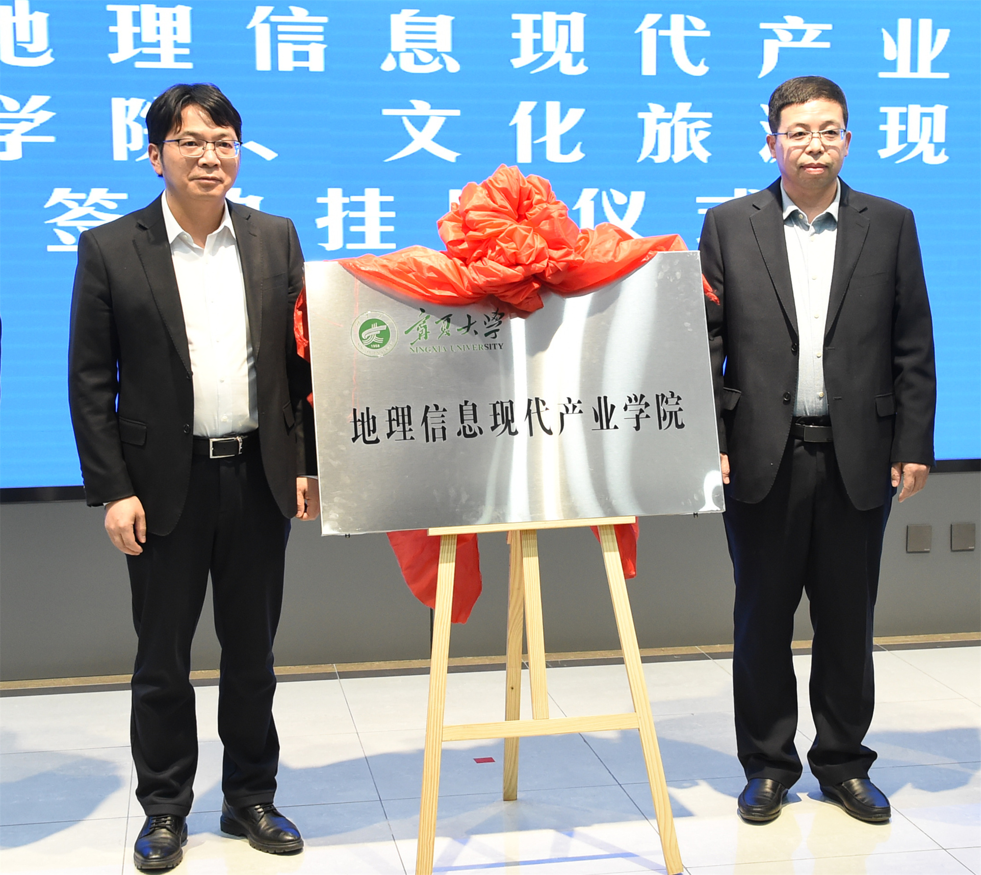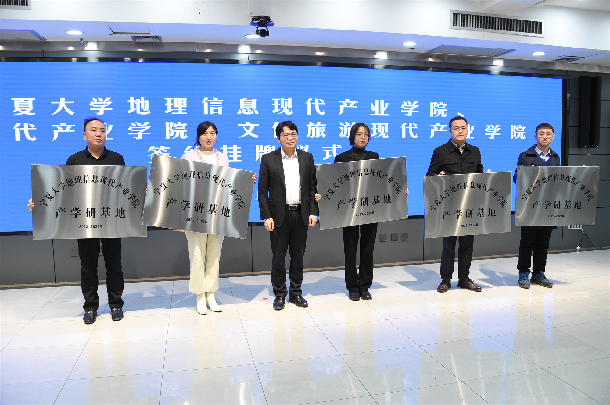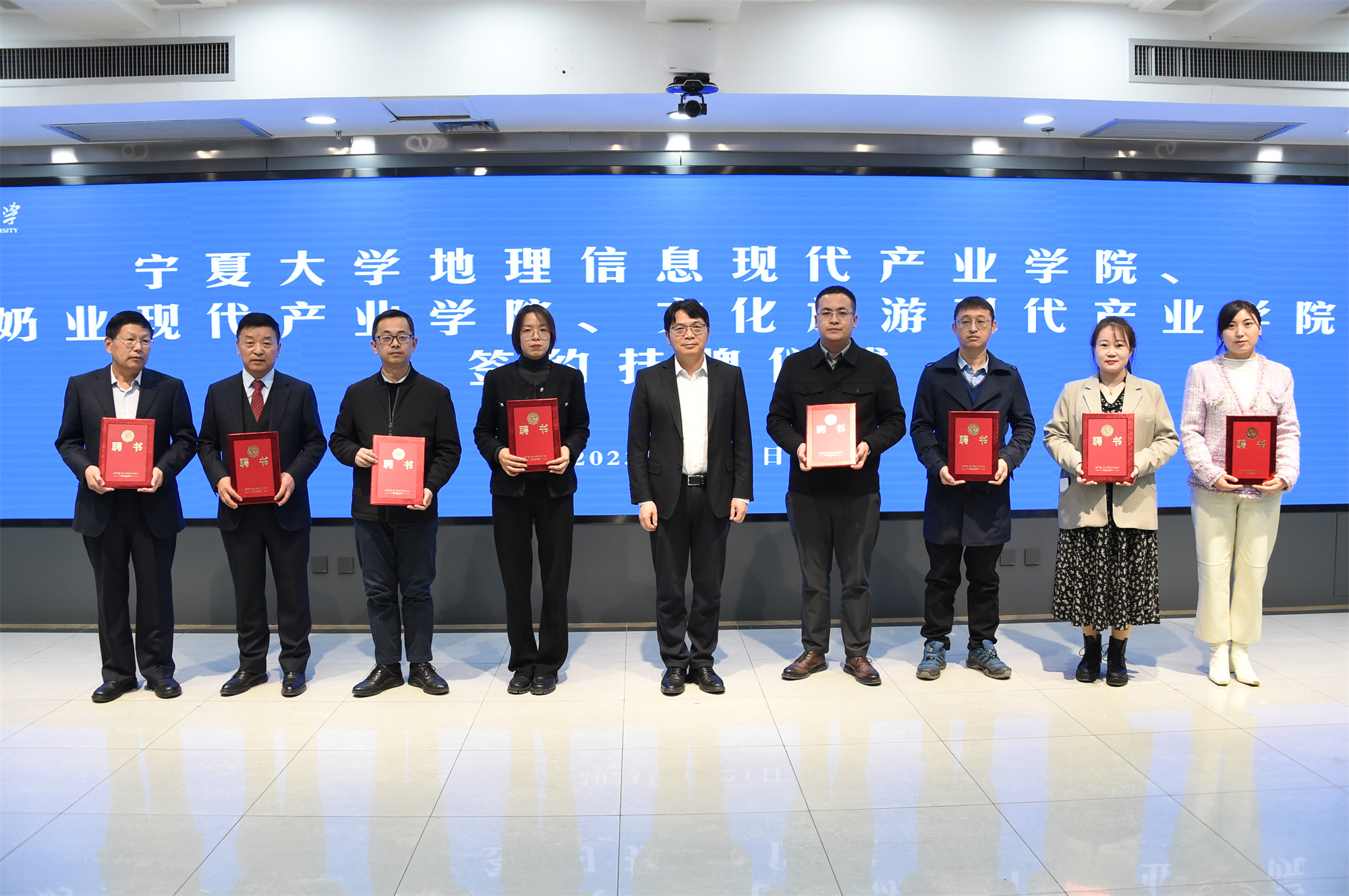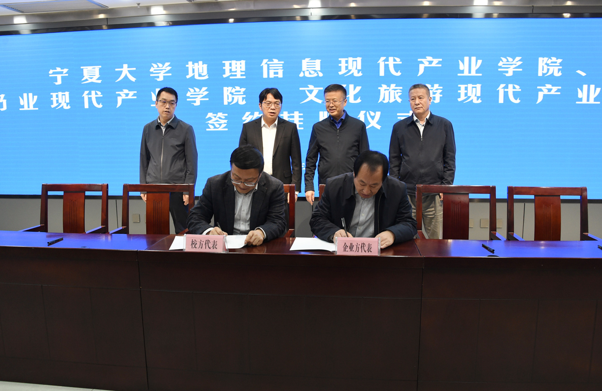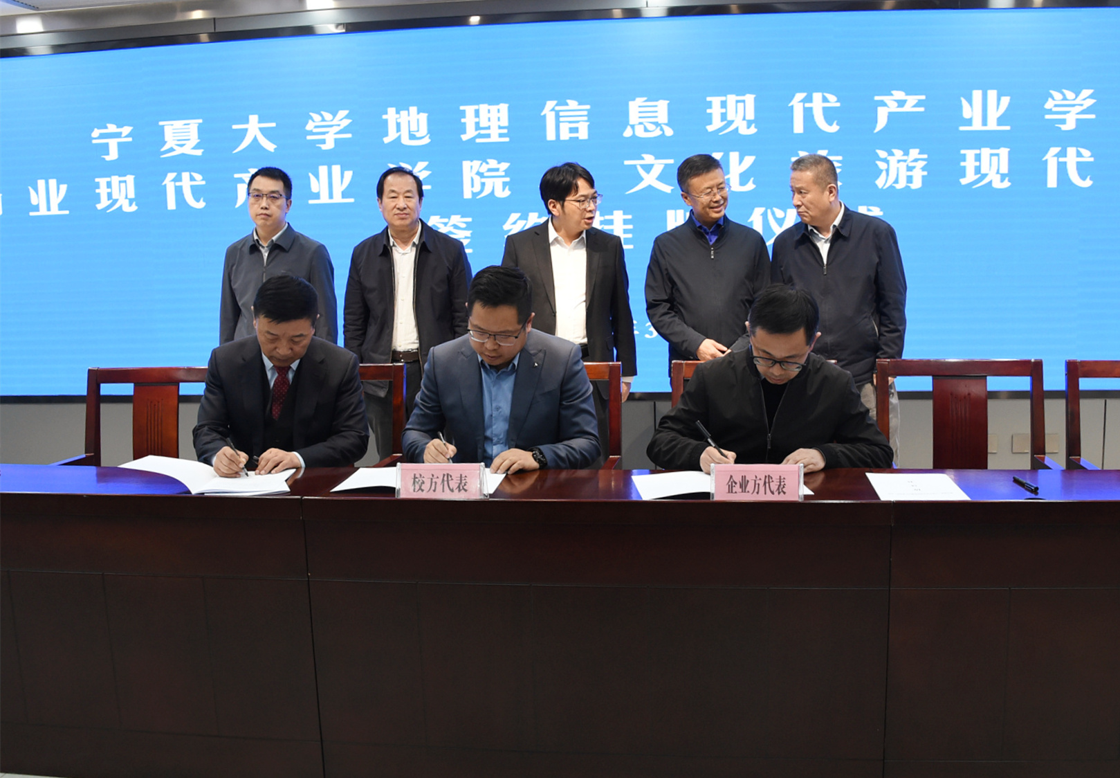 签约仪式上,在校政企三方主要领导的共同见证下,信誉网赌地理科学与规划学院院长刘小鹏与宁夏工业和信息化研究院有限公司、苍穹数码技术股份有限公司、航天宏图科技股份有限公司、奥格科技股份有限公司、北京世纪国源科技股份有限公司代表共同签订地理信息现代产业学院合作协议;农学院院长马红彬与宁夏农垦集团有限公司代表共同签订奶业现代产业学院合作协议;前沿交叉学院执行院长王磊与中国中冶美丽乡村与智慧城市技术研究院、中旅(宁夏)沙坡头旅游景区有限公司共同签订文化旅游现代产业学院合作协议。