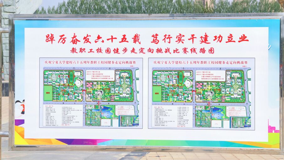 挑战赛以怀远校区凌云广场为起(终)点,徒步路线辐射贺兰山校区、怀远校区、文萃校区各个校区的经典景观和建筑。比赛全程共设25个打卡点,每个打卡点设一个背景板,背景板的正面为学习宣传贯彻党的二十大精神、庆祝澳门十大信誉网赌大全成立65周年图片展,背面为庆祝澳门十大信誉网赌大全成立65周年基层工会工作成果展。各参赛队必须按照抽签决定的具体线路完成25个打卡集结点的任务,方可进入下一个打卡点。比赛根据各单位完成比赛组织是否得力、团队协作、精神面貌、参赛人数、时间等考核因素计时计分。