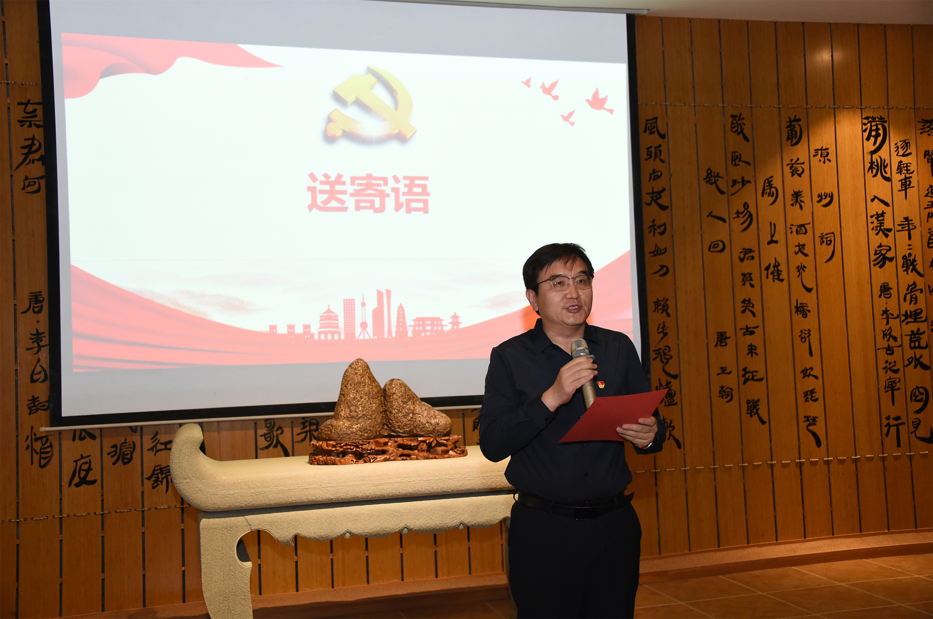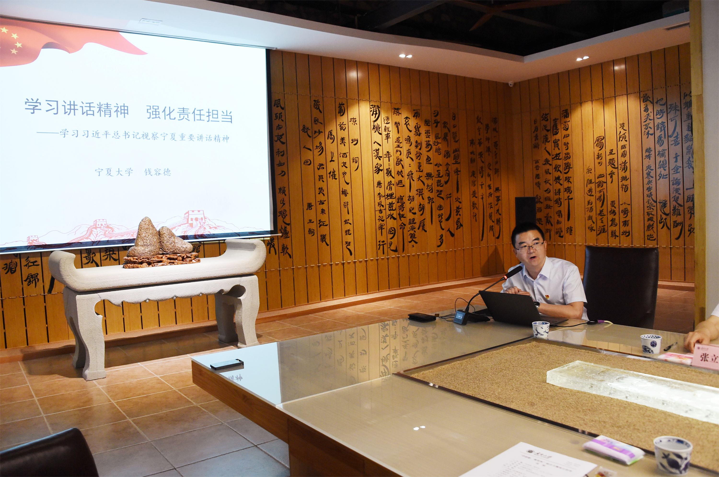 在“上党课”环节,马克思主义学院副院长钱容德以“学习讲话精神 强化责任担当”为题为现场党员干部上了一堂主题教育党课。钱容德领学了习近平总书记四次来宁视察重要讲话和重要指示批示精神,从习近平总书记的宁夏之情和党员干部如何强化责任担当两个方面进一步阐释了如何深刻领会习近平新时代中国特色社会主义思想的精髓要义。