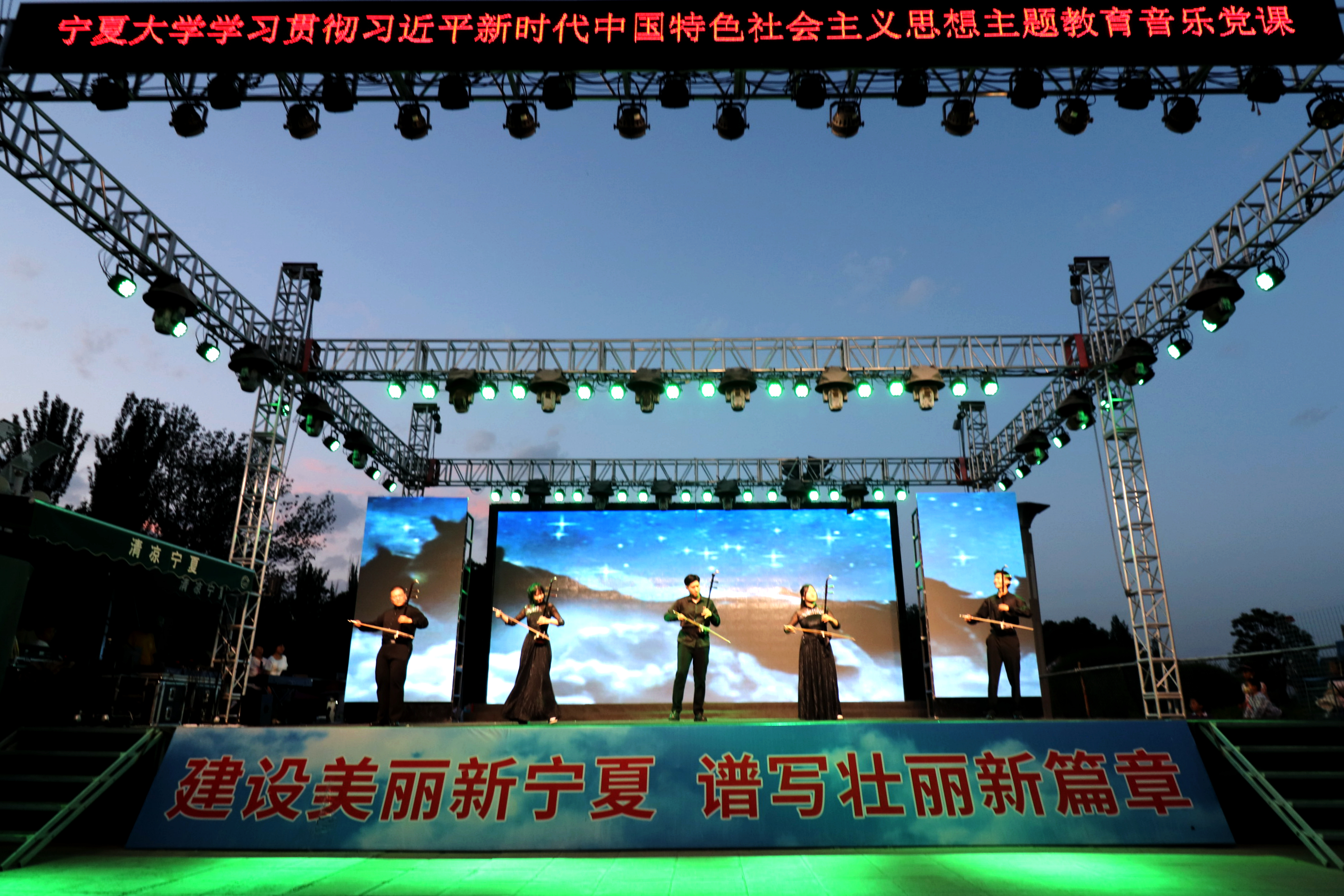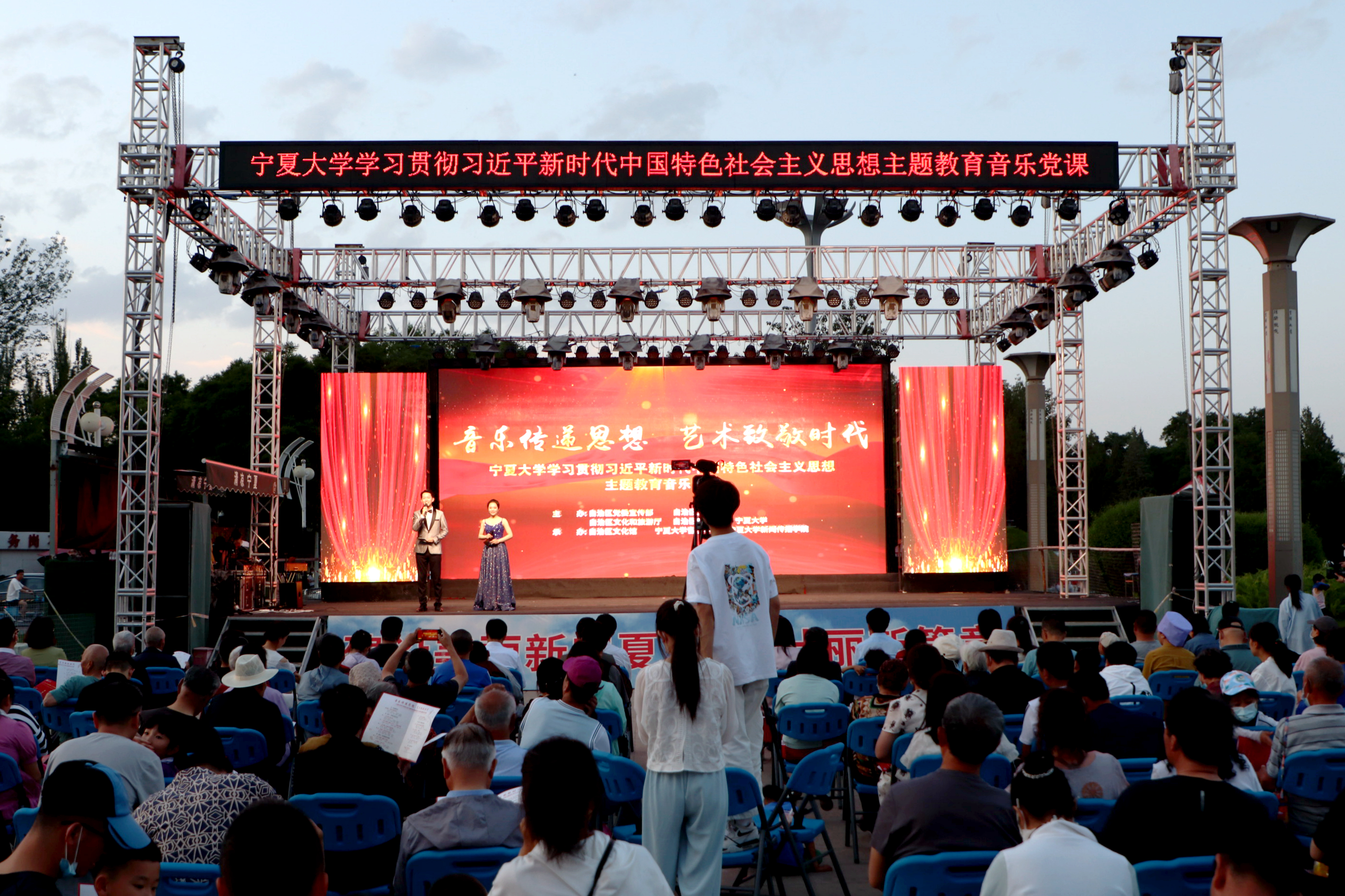 【澳门十大信誉网赌大全新闻中心讯 张景/文 张景 学生记者:池骋 文轩轩/图】为深入开展党的二十大精神和习近平总书记视察宁夏重要讲话指示批示精神“大学习、大讨论、大宣传、大实践”活动,推动党的二十大精神走进基层、走进群众,巩固壮大主流思想舆论,6月9日,由自治区党委宣传部、自治区文明办、自治区文化和旅游厅、自治区财政厅联合举办,澳门十大信誉网赌大全承办的“音乐传递思想,艺术致敬时代”学习贯彻习近平新时代中国特色社会主义思想主题教育音乐党课在光明广场精彩上演。校党委副书记周震,党委常委、宣传部部长高永兴,音乐学院、新闻传播学院班子成员、组织部相关负责人等与市民一同在现场观看演出。