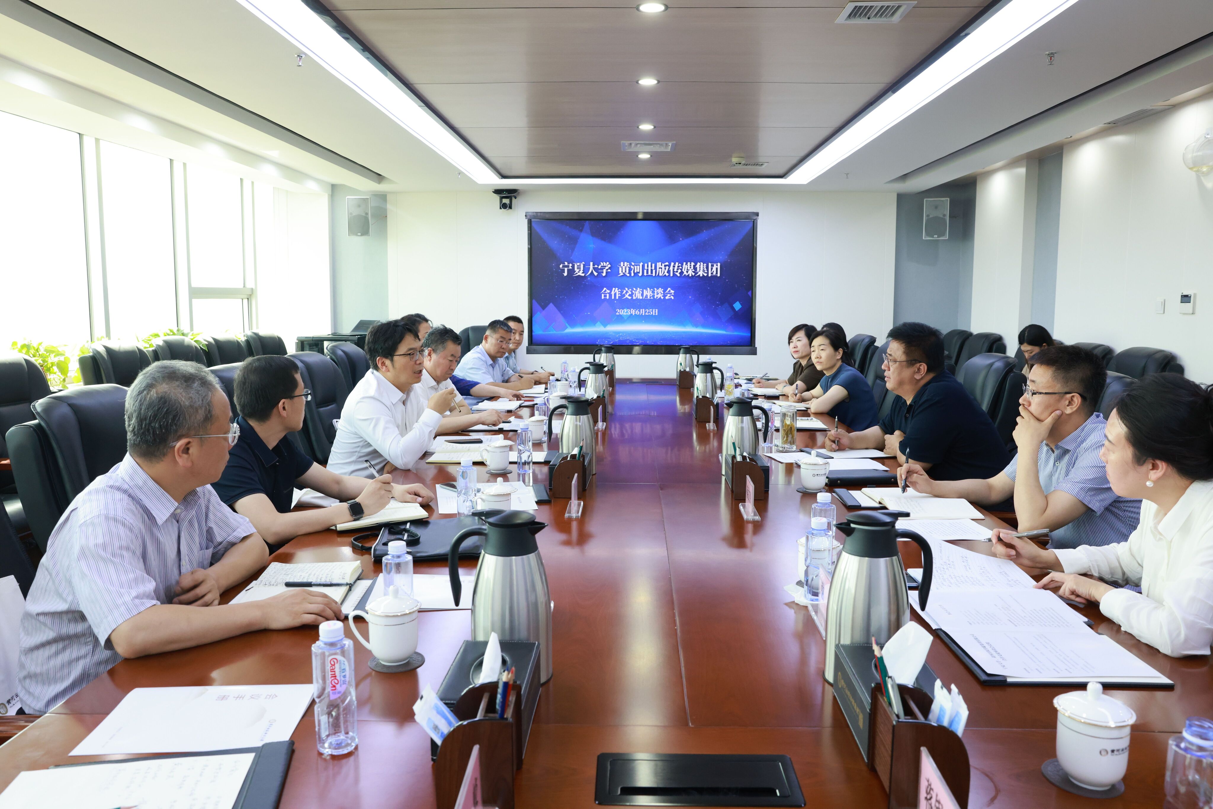 黄河出版传媒集团党委委员、副总经理蔡文贵、杨立国、孟永光及集团有关部门负责人,学校办公室、对外合作交流处、本科生院、资产与实验室管理处、图书馆、创新创业学院相关负责人参加交流活动。