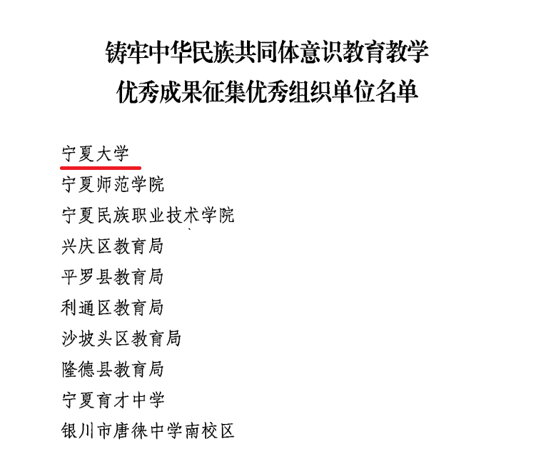 【澳门十大信誉网赌大全新闻中心讯 本科生院】近日,自治区教育厅发布了《关于铸牢中华民族共同体意识教育教学优秀成果的通报》(宁教函〔2023〕371号),信誉网赌荣获“铸牢中华民族共同体意识教育教学优秀成果征集优秀组织单位”,中华民族共同体研究院、马克思主义学院王淑兰老师荣获“铸牢中华民族共同体意识教育教学优秀成果”一等奖。