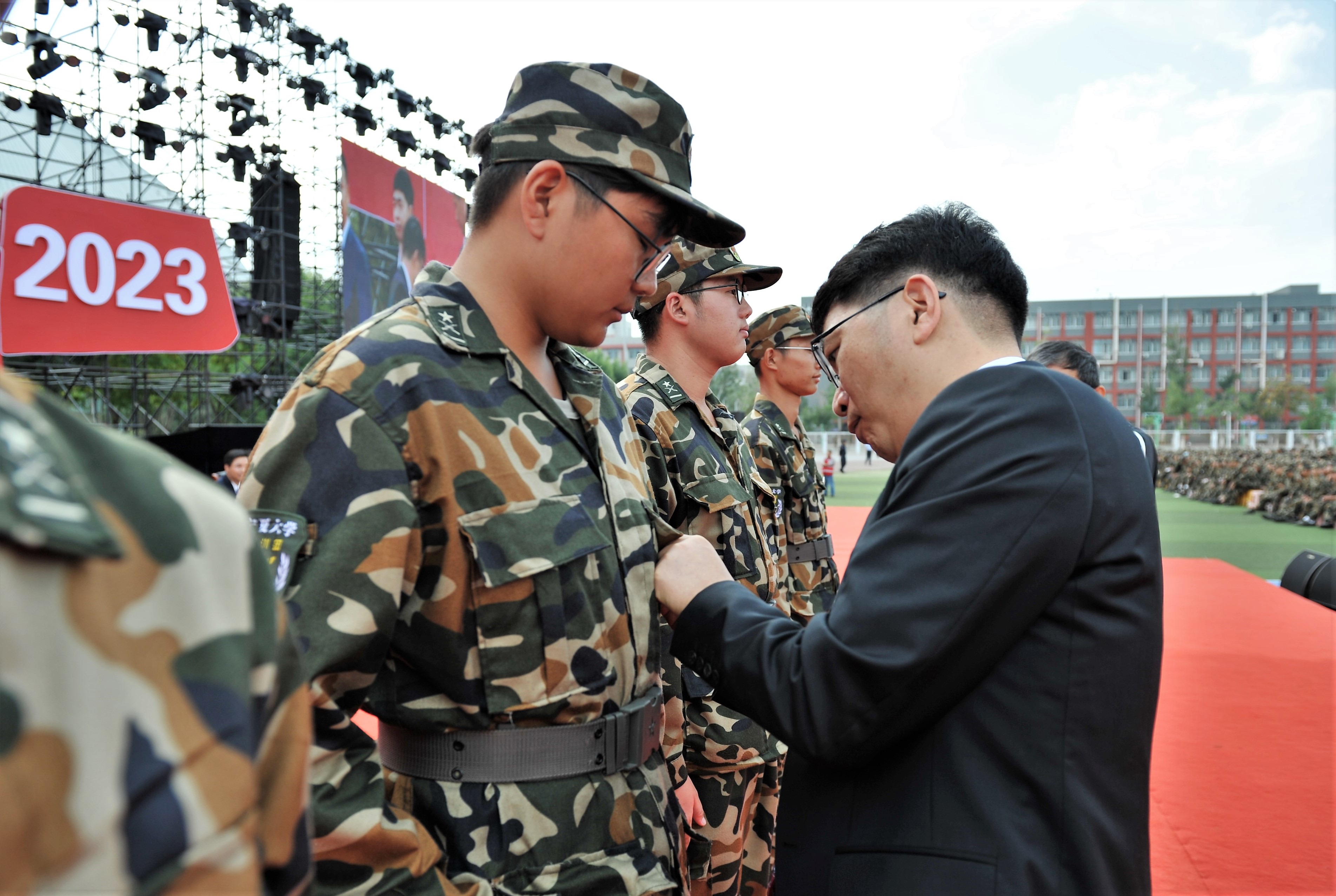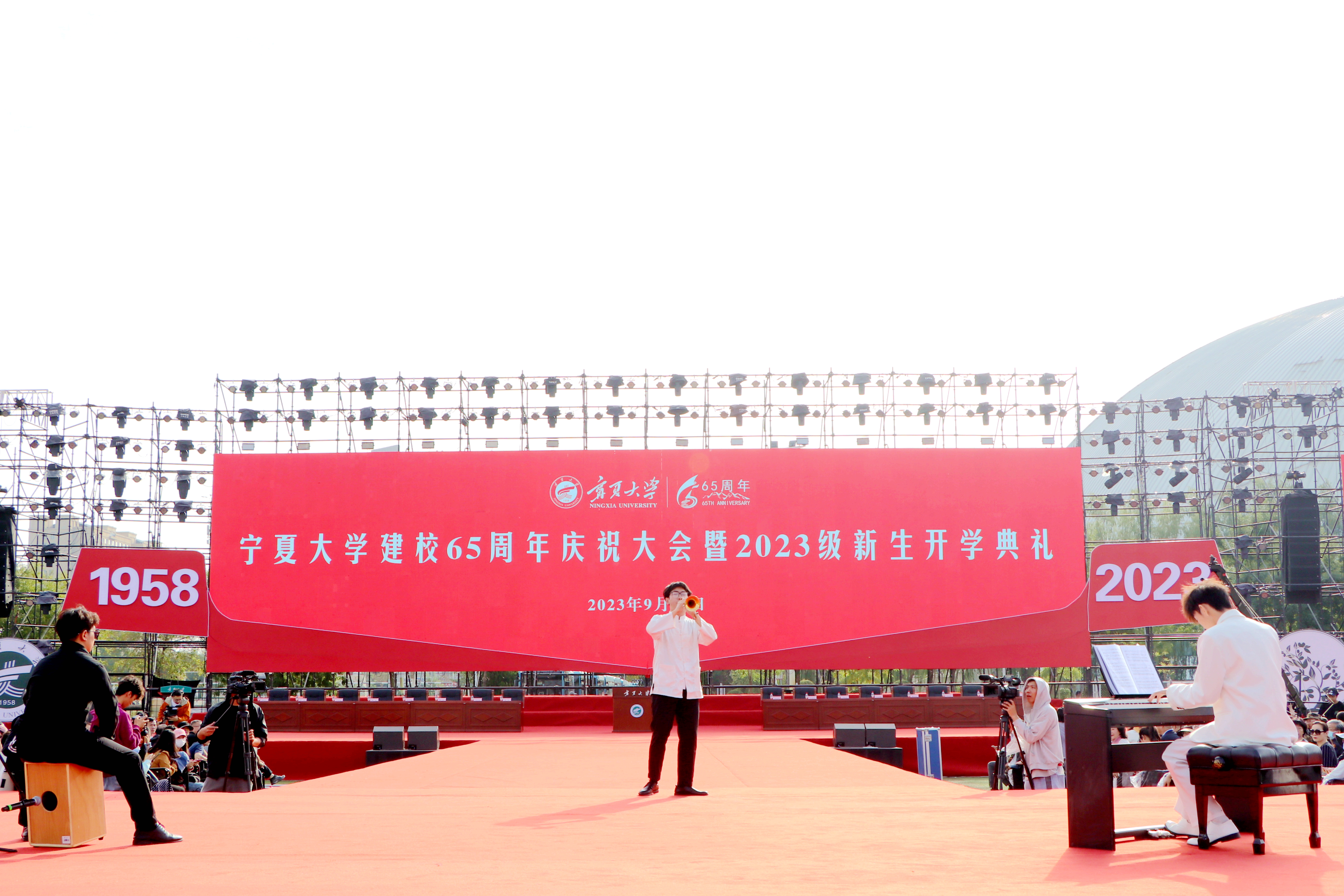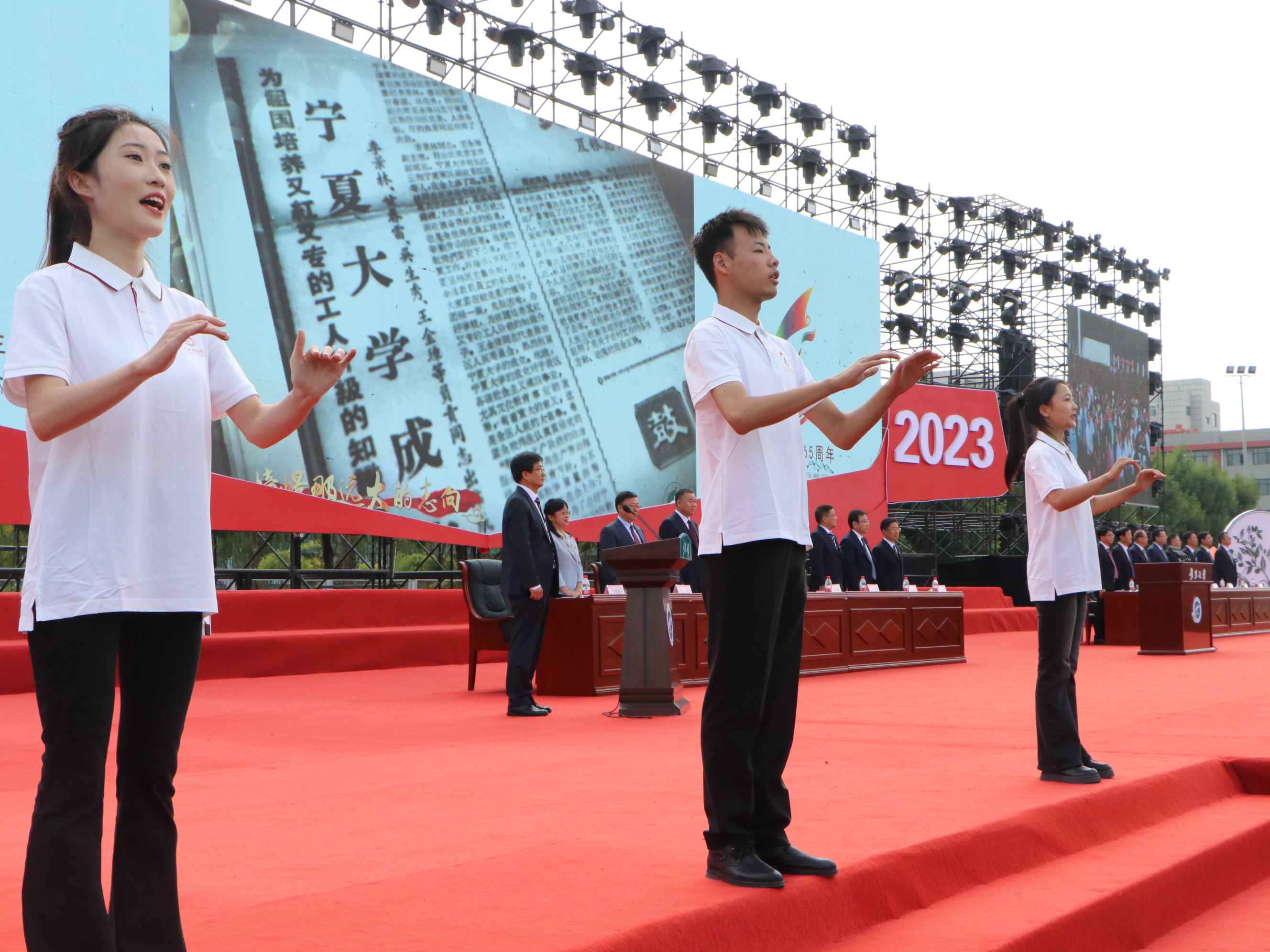 党群行政、教学科研、教辅单位直属单位负责人,校友代表、教师代表、全体2023级新生,其他年级学生代表在现场参加庆祝大会,中卫校区新生在应理报告厅视频分会场同步收看庆祝大会。