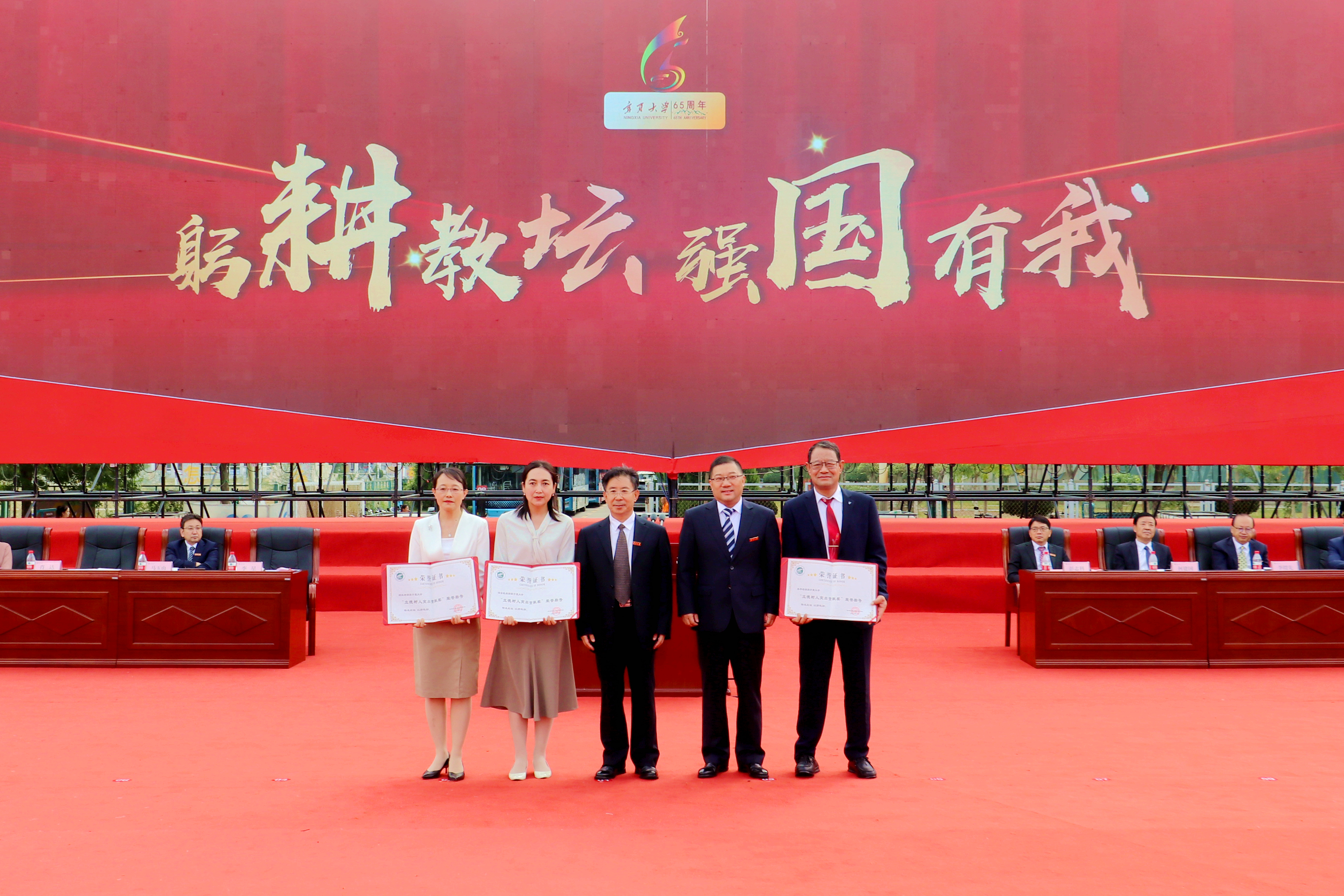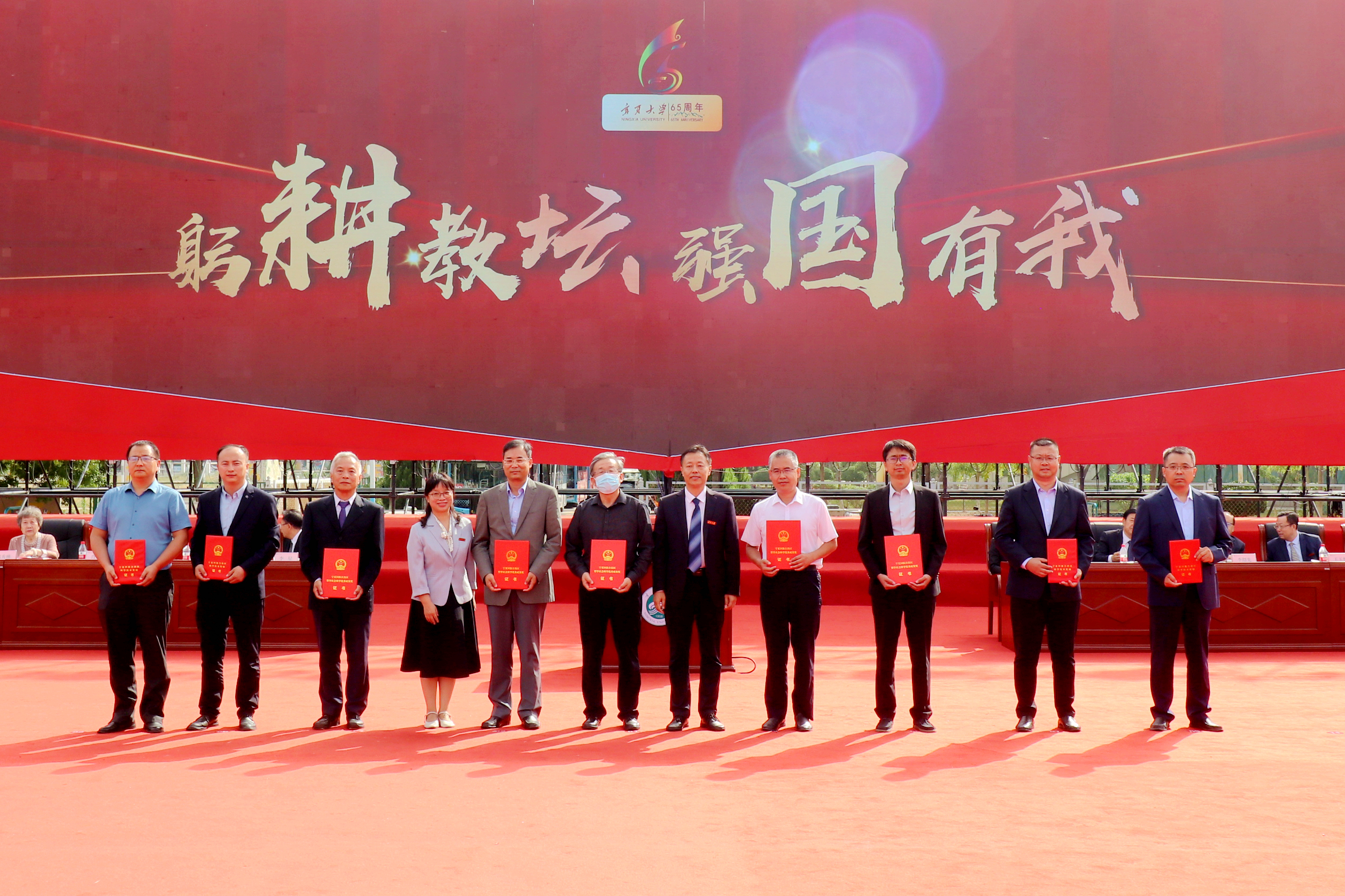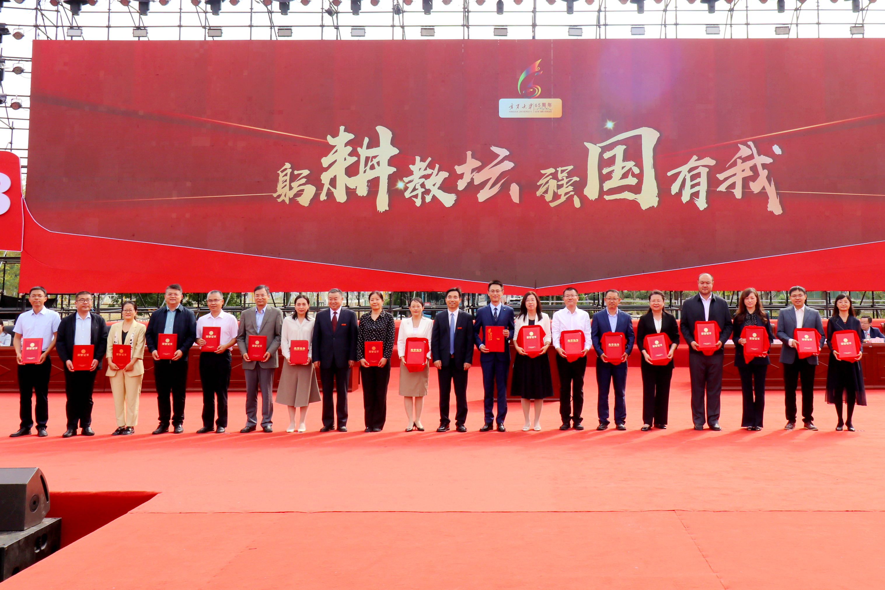 校领导和与会嘉宾为获得全国青年教师教学基本功大赛和全国高校教学创新大赛二等奖以上教师,获得全区教育工作先进个人和优秀教师,获得自治区高等学校教学成果特等奖、一等奖获奖教师代表颁奖;为获得宁夏第四届哲学社会科学突出贡献奖和第十五届哲学社会科学优秀成果奖一等奖,自治区科技进步奖一等奖、二等奖教师颁奖;为获得立德树人岗位标兵、立德树人楷模、立德树人突出贡献奖获奖教师颁奖;为从教满35 年教师代表颁发荣誉证书、纪念牌;为 2022—2023年度荣休教师代表颁发纪念牌。