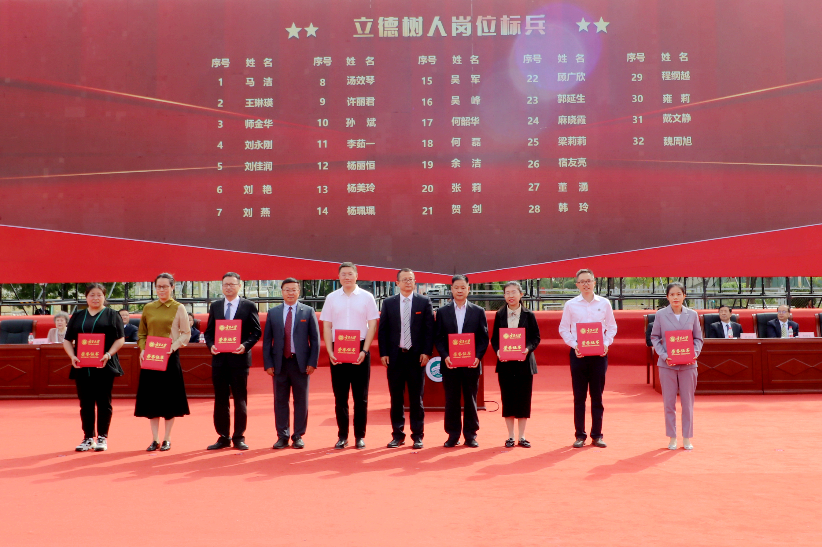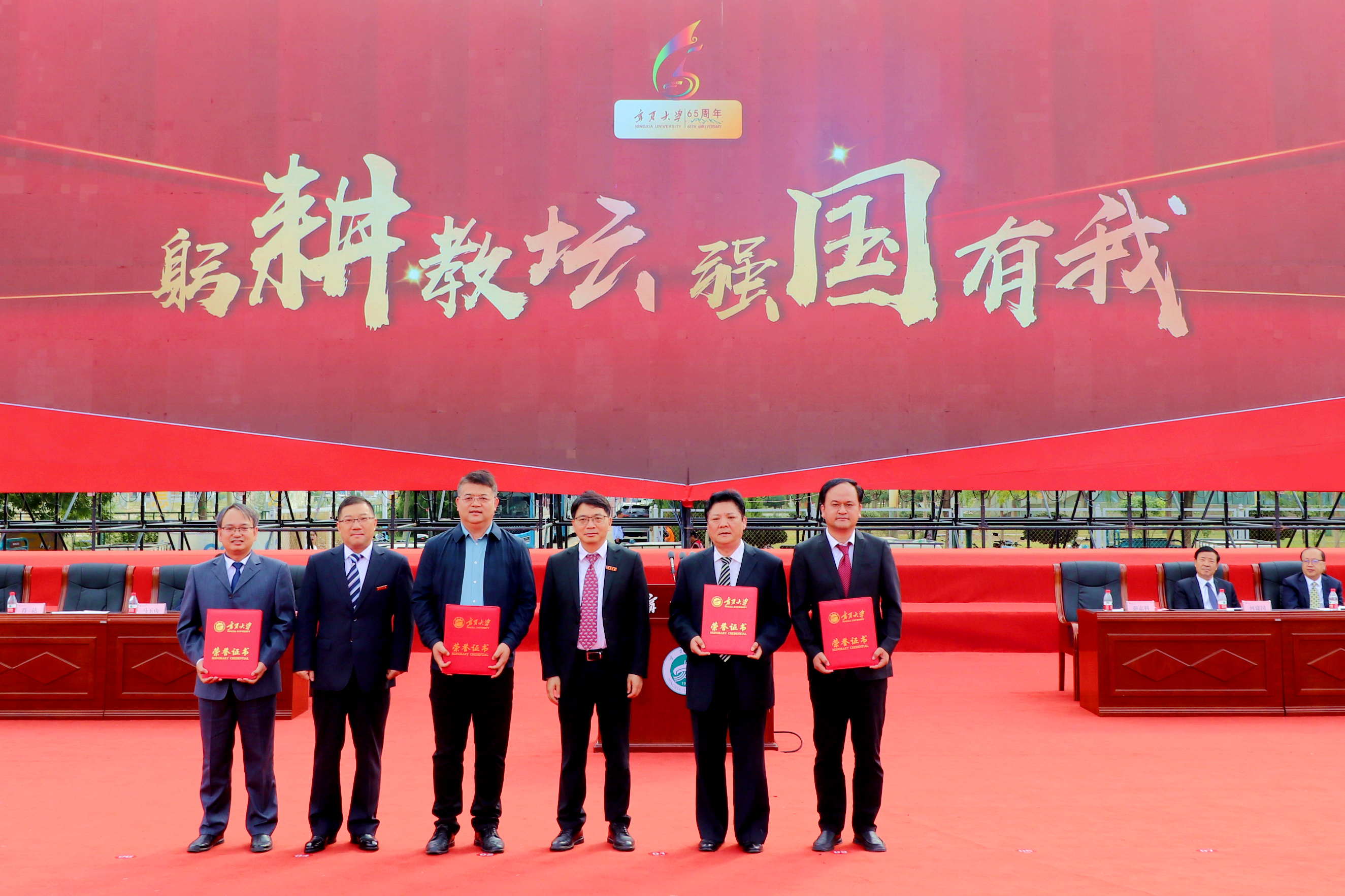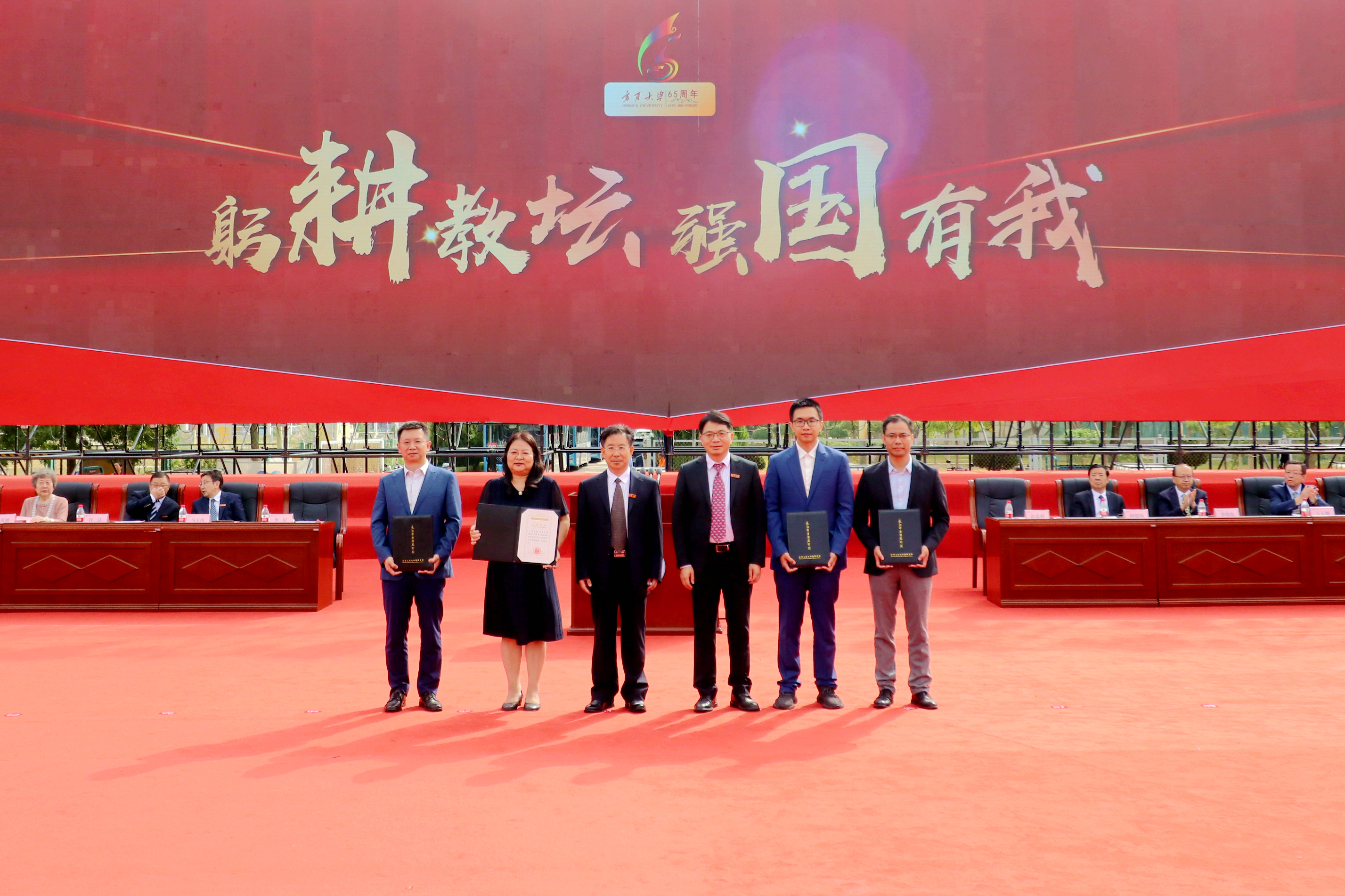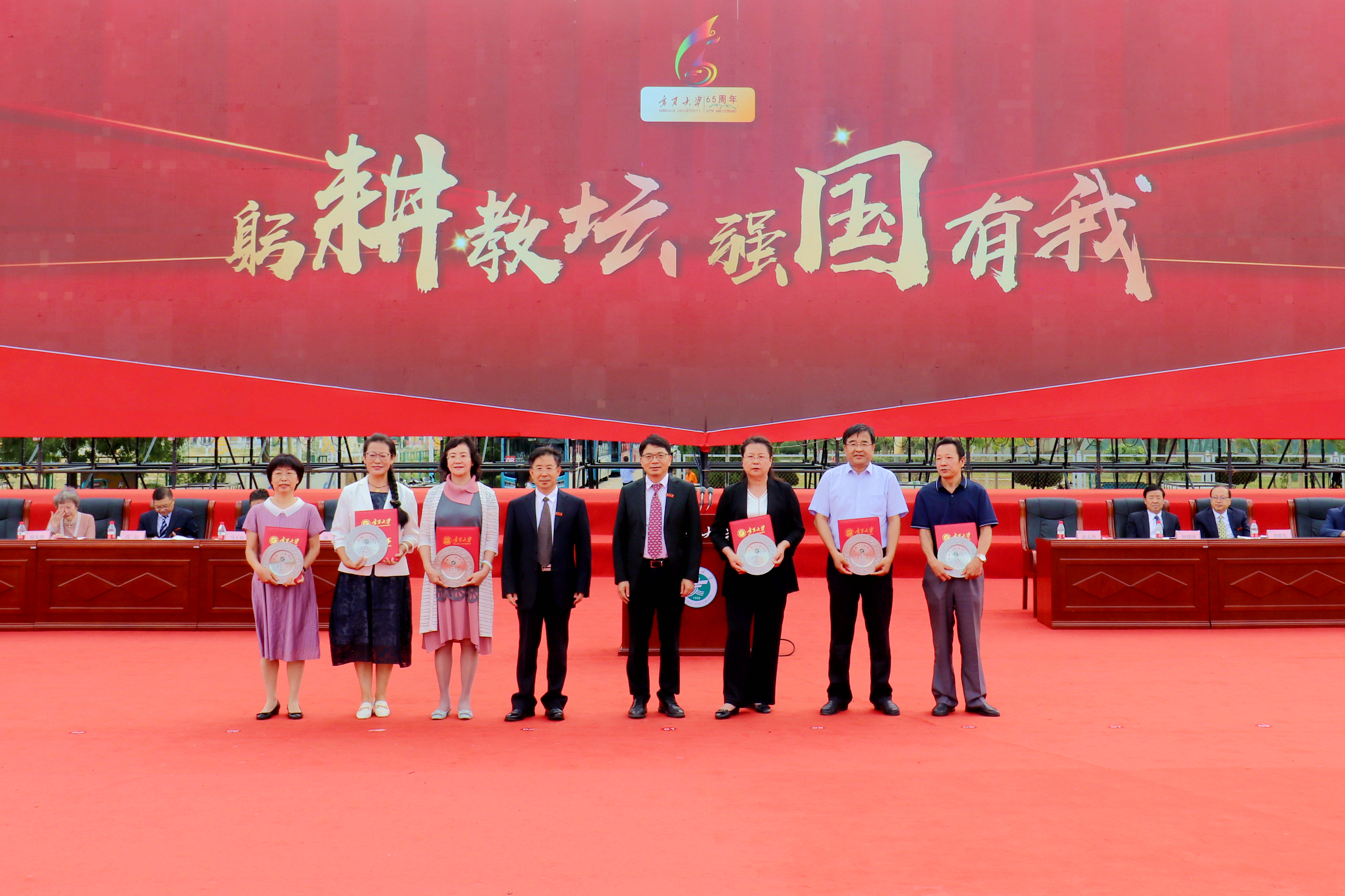 校领导和与会嘉宾为获得全国青年教师教学基本功大赛和全国高校教学创新大赛二等奖以上教师,获得全区教育工作先进个人和优秀教师,获得自治区高等学校教学成果特等奖、一等奖获奖教师代表颁奖;为获得宁夏第四届哲学社会科学突出贡献奖和第十五届哲学社会科学优秀成果奖一等奖,自治区科技进步奖一等奖、二等奖教师颁奖;为获得立德树人岗位标兵、立德树人楷模、立德树人突出贡献奖获奖教师颁奖;为从教满35 年教师代表颁发荣誉证书、纪念牌;为 2022—2023年度荣休教师代表颁发纪念牌。
