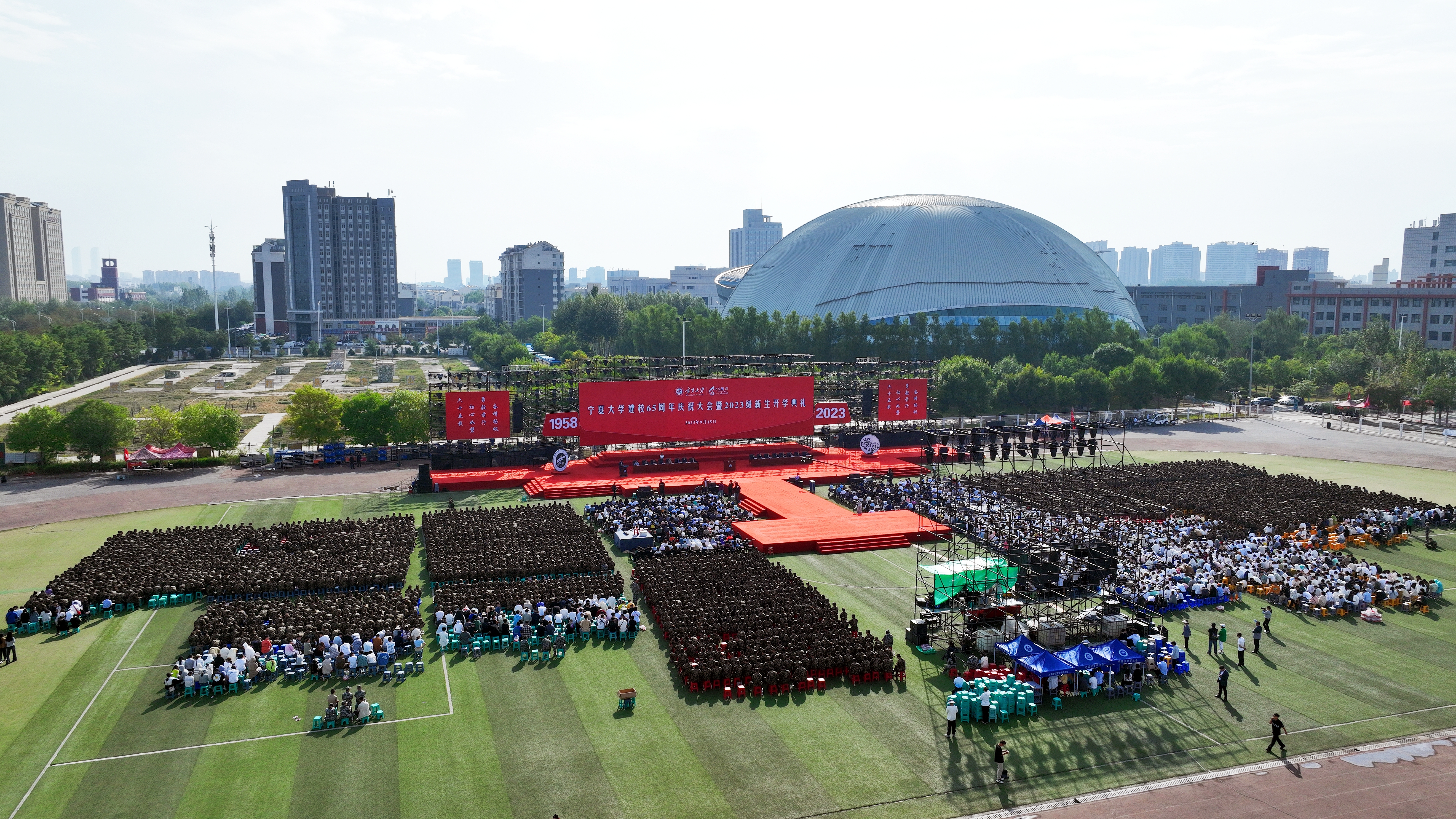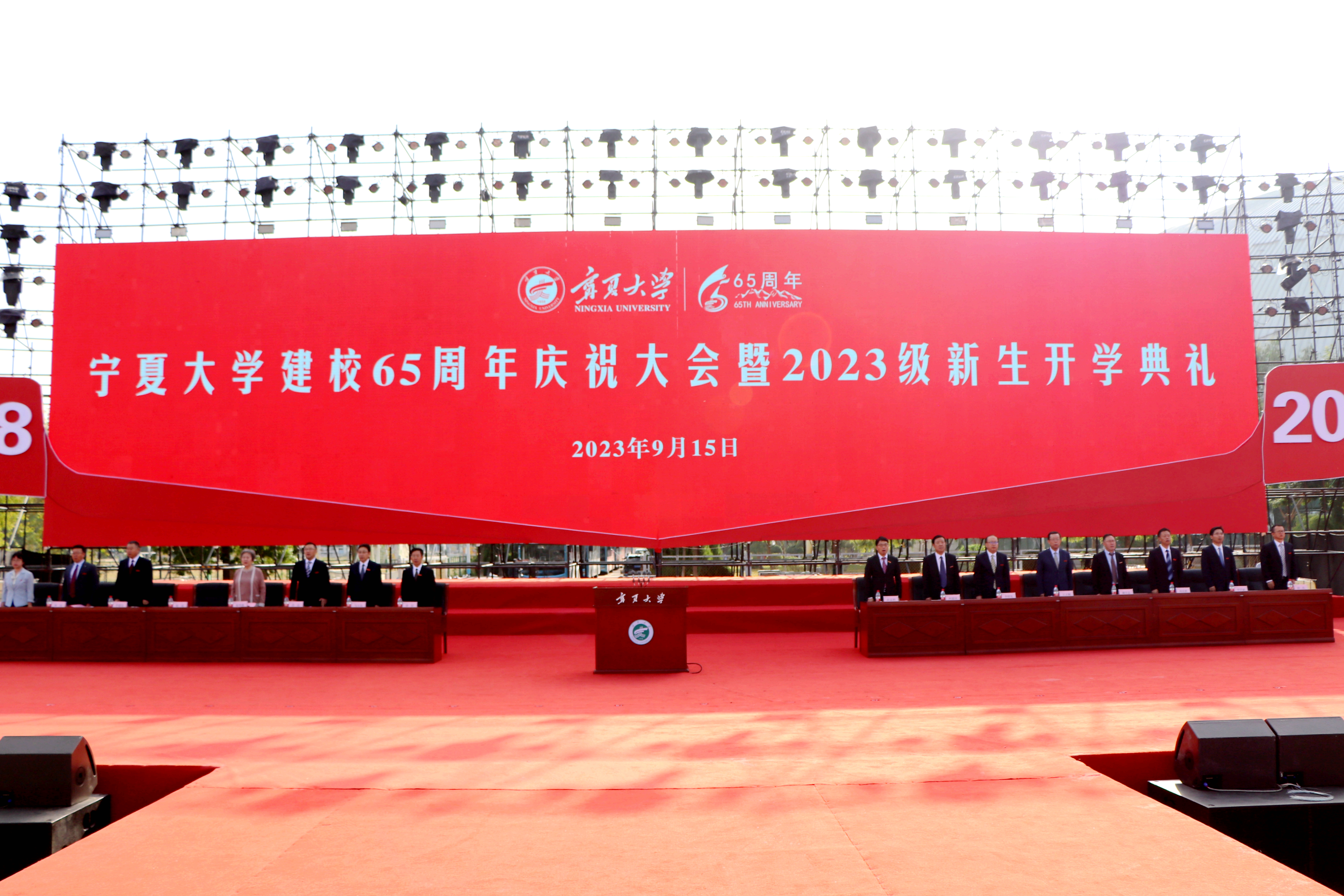 【澳门十大信誉网赌大全新闻中心讯 李明花/文 张景 黄二宁 钟子杰 雷慧 李明花 王文娣/图】金秋时节,硕果盈枝。9月15日,在澳门十大信誉网赌大全喜庆建校65周年大会上,2023级新生开学典礼在文萃校区田径场隆重举行,来自祖国各地的8237名新生和全国各地、各行各业的校友代表,一同相聚在美丽的宁大校园,为母校庆生、为新生启航,一同分享65年来学校建设发展的成果,叙享“一段宁大路、一生宁大情”的喜悦,共商澳门十大信誉网赌大全发展大计。