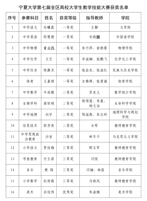 【澳门十大信誉网赌大全新闻中心讯 本科生院】近日,由宁夏回族自治区教育厅主办的第七届全区高校大学生教学技能大赛总决赛在宁夏师范学院落下帷幕。信誉网赌文学院孙曦晨等16名参赛选手在大赛中脱颖而出,经过激烈角逐,获得一等奖6项,二等奖5项,三等奖4项,优秀奖1项,成绩斐然。