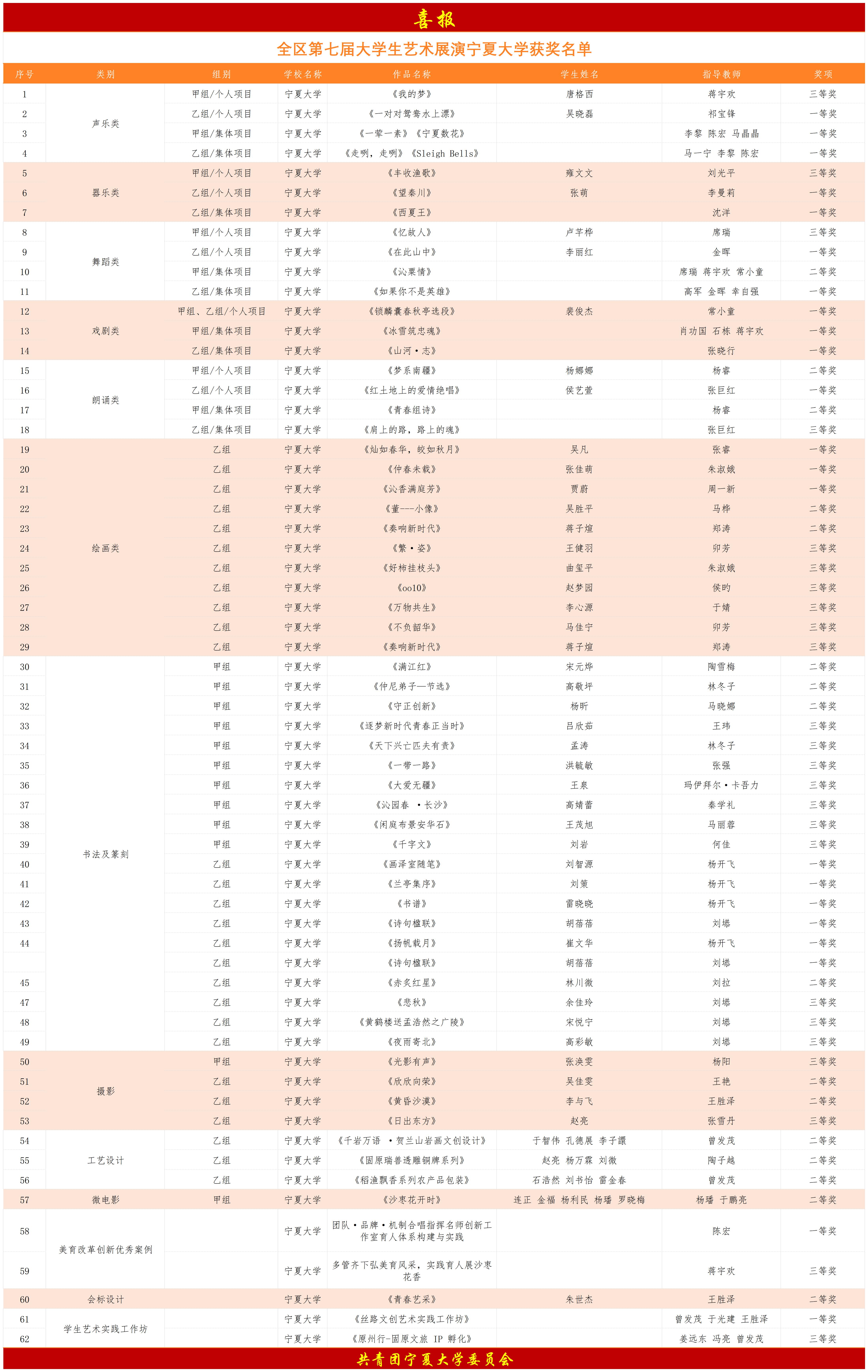 作为澳门十大信誉网赌大全生艺术教育的最高水平展示,展演活动每三年举办一次,本届大学生艺术展演活动以“厚植家国情怀,涵养进取品格”为主题,自2023年4月正式启动以来,学校印发了《全区第七届大学生艺术展演活动澳门十大信誉网赌大全实施方案》,成立了专项工作组,划拨专项经费,广泛动员全校师生参与活动。在自治区集中展演中,学校共推荐作品103件,其中艺术作品类76件,艺术表演类18件,艺术实践工作坊4件,高校美育改革创新优秀案例3件,会标设计2件。经过激烈角逐,信誉网赌获“特殊贡献奖”,获一等奖21项、二等奖16项、三等奖24项,推荐作品数量和质量、获奖作品数量和质量较往届均有大幅提升,取得了新的突破。
