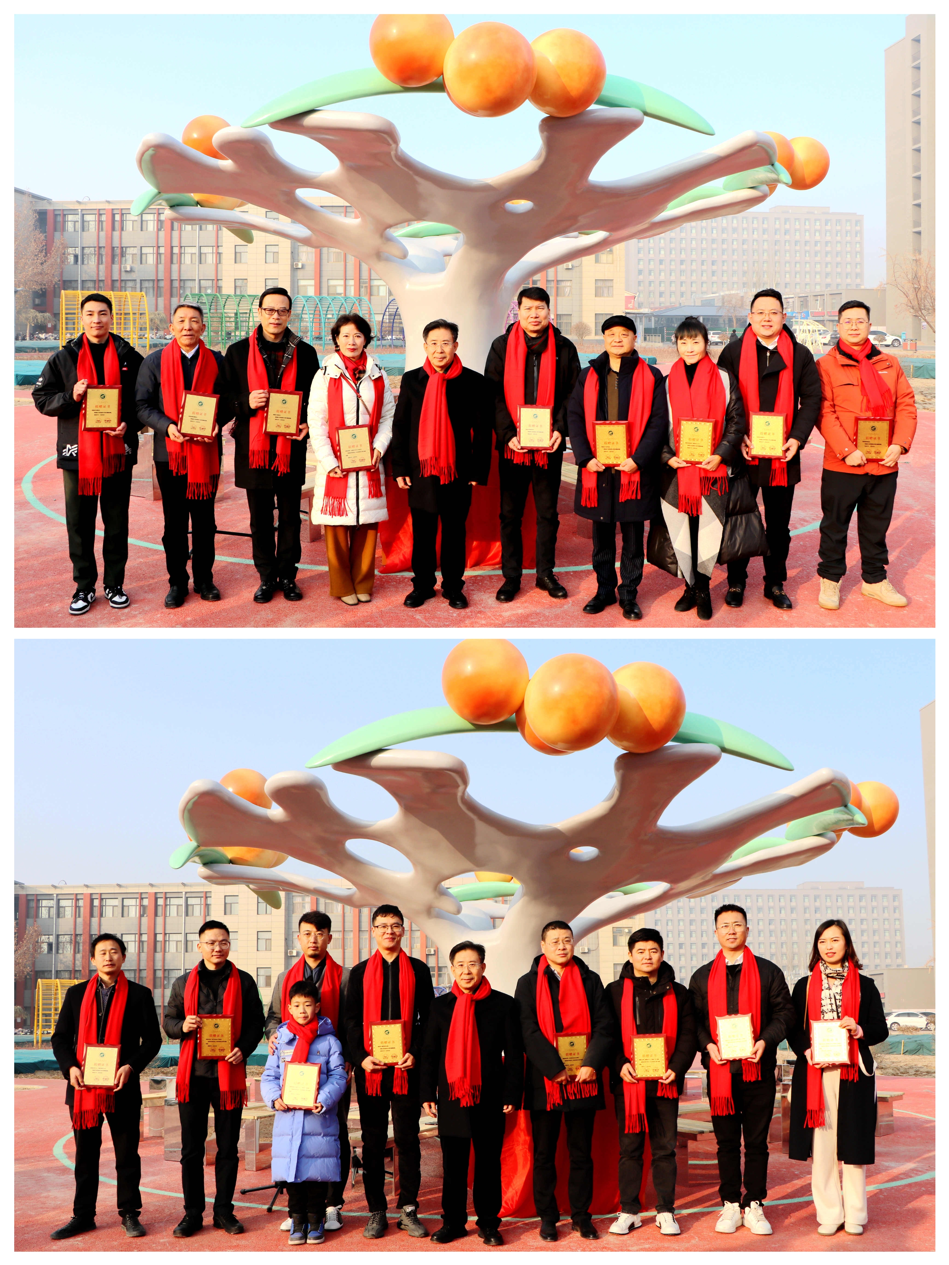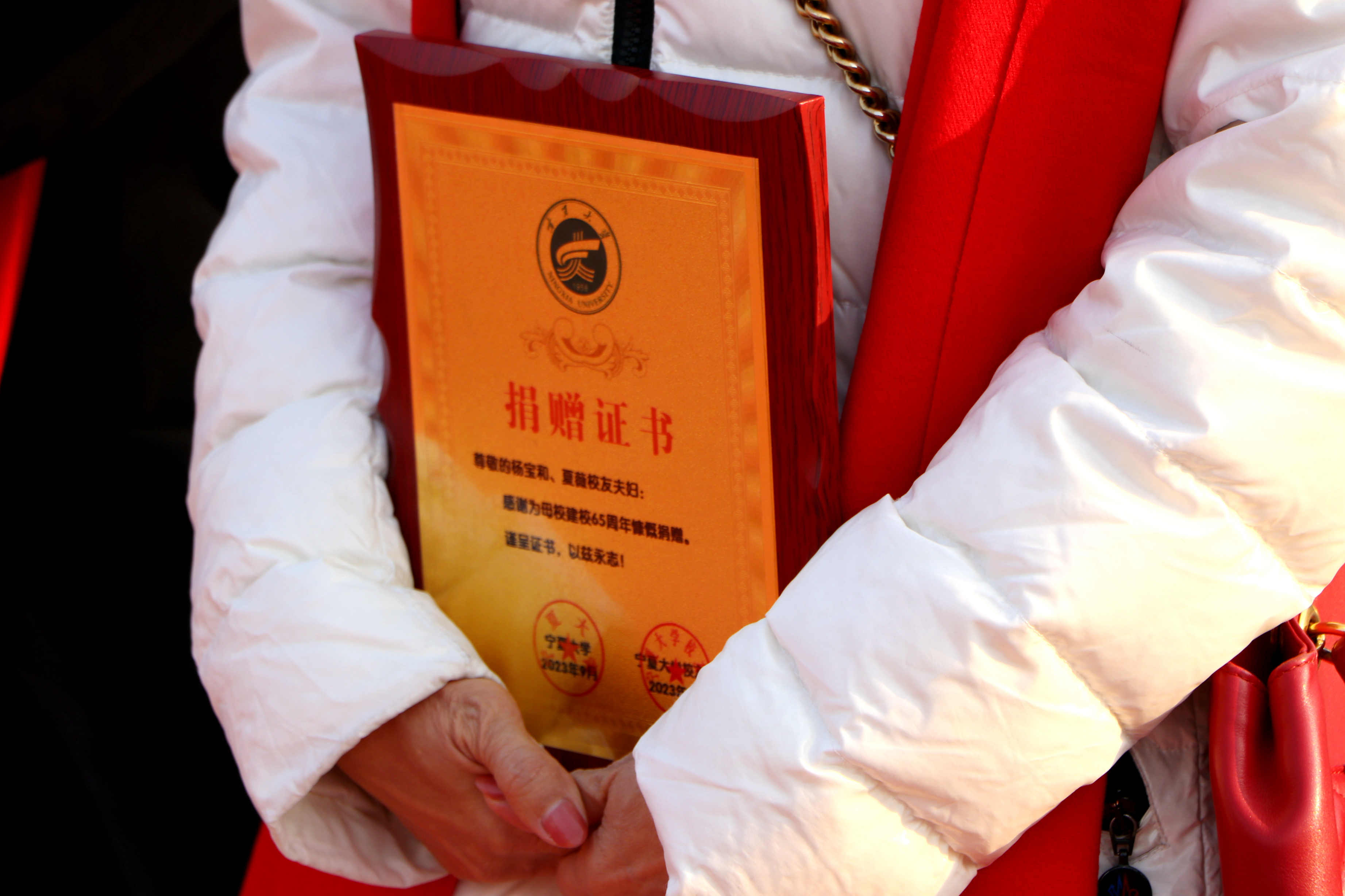 仪式上,李星为校友代表颁发捐赠证书,并与校友代表共同为“沙枣树精神”雕塑揭幕。