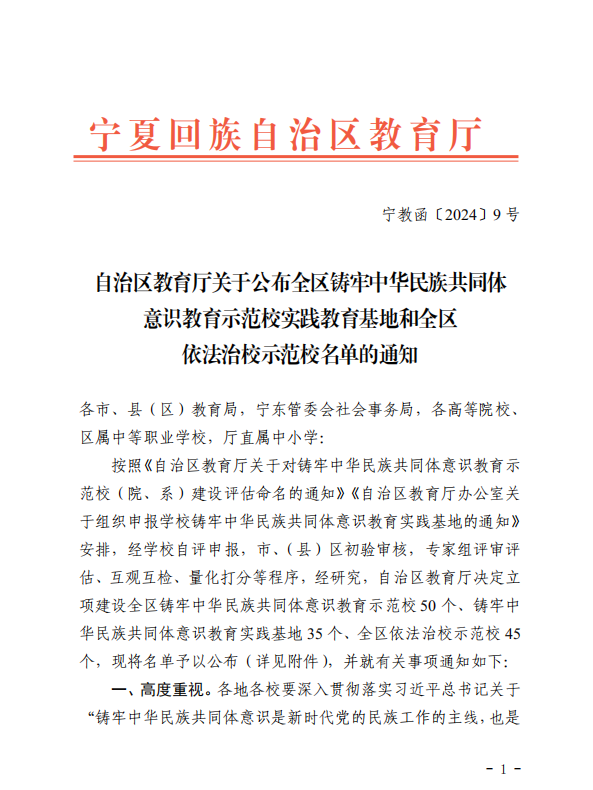 【澳门十大信誉网赌大全新闻中心讯 办公室 党委统战部】近日,宁夏回族自治区教育厅印发了《关于公布全区铸牢中华民族共同体意识教育示范校实践教育基地和全区依法治校示范校名单的通知》(宁教函〔2024〕9号),公布了立项建设的50个全区铸牢中华民族共同体意识教育示范校,35个铸牢中华民族共同体意识教育实践基地和45个全区依法治校示范校名单,信誉网赌经过自评申报,专家组评审评估、互观互检、量化打分等程序,最终获评全区铸牢中华民族共同体意识教育示范学校、实践教育基地和全区依法治校示范校,澳门十大信誉网赌大全附属中学获评全区依法治校示范校。
