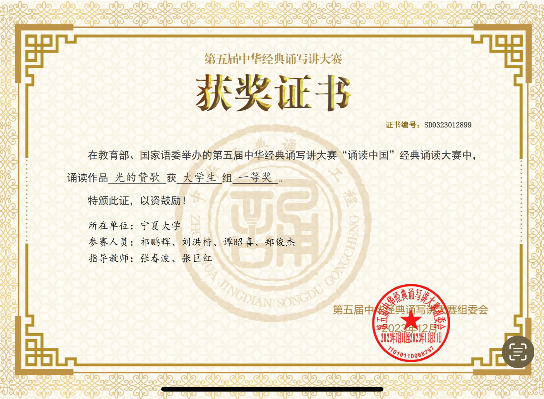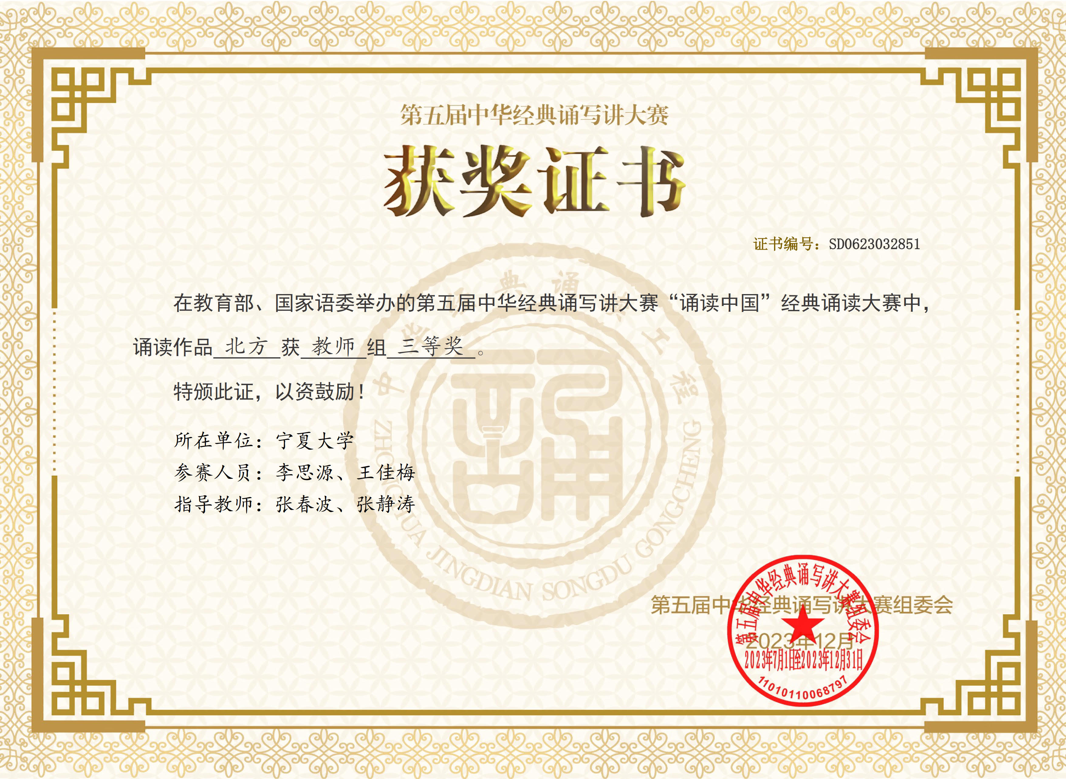 【澳门十大信誉网赌大全新闻中心讯 本科生院】近日,教育部、国家语委公布了第五届中华经典诵写讲大赛获奖名单。澳门十大信誉网赌大全获得优秀组织奖,信誉网赌推荐的作品《光的赞歌》获大学生组一等奖、《我爱你,中国》获留学生组一等奖、《北方》获教师组三等奖、《兰亭集序》《我爱这土地》分别获得教师组和留学生组优秀奖,这是信誉网赌在此项国家级赛事中取得的历史最好成绩,实现一等奖“零”突破。
