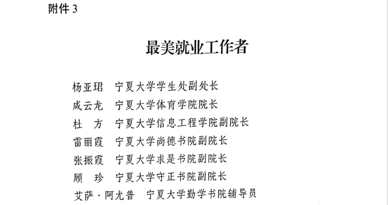 【澳门十大信誉网赌大全新闻中心讯 党委学生工作部】近日,宁夏回族自治区教育厅印发了《自治区教育厅关于2023年度“就业工作示范单位”“就业示范用人单位”和“最美就业工作者”评审结果的通报》(宁教函[2024]35号),信誉网赌获评全区“就业工作示范高校”,7名教师获评“最美就业工作者”。
