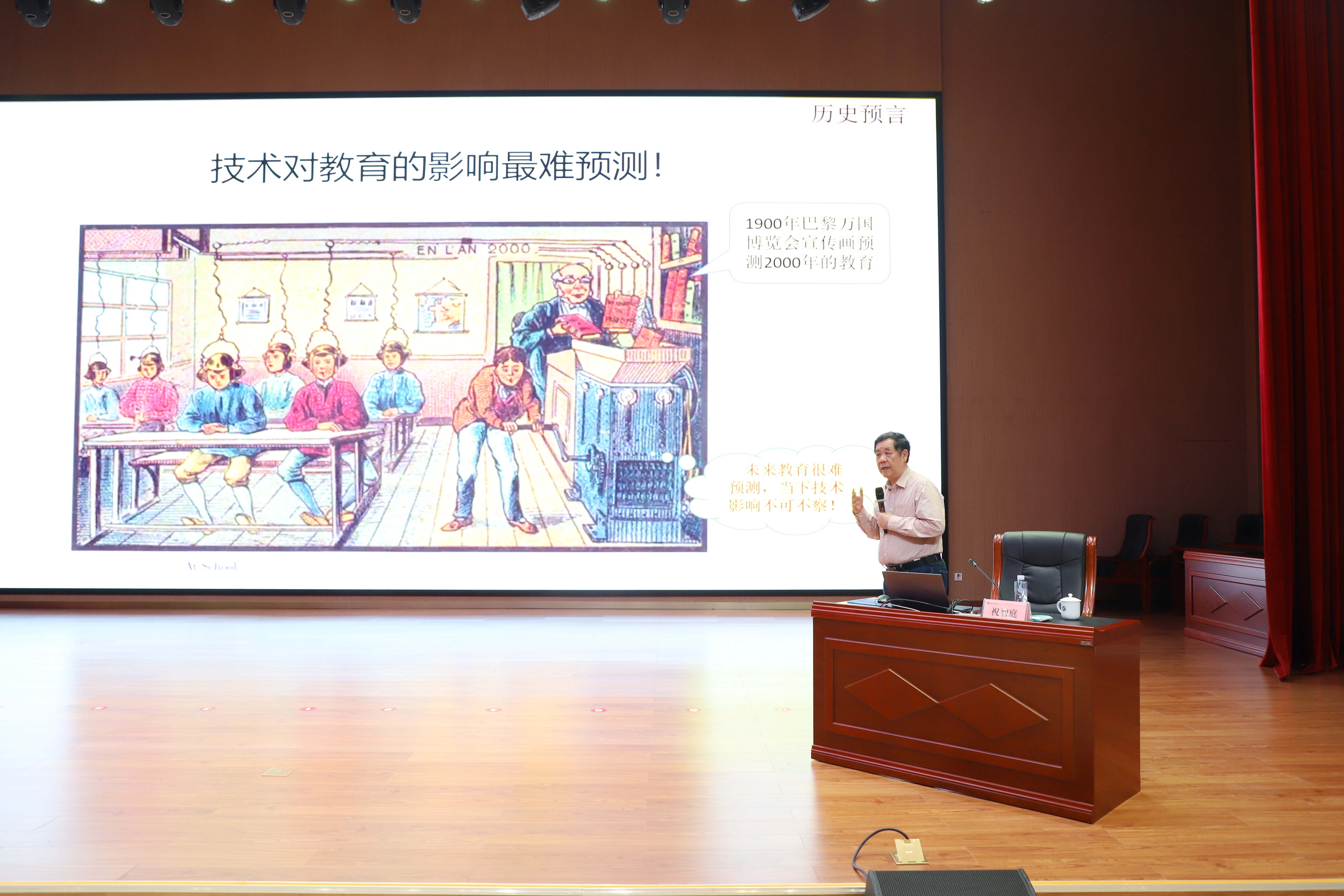 祝智庭以“融创教育:数智赋能高校新质发展的实践路径”为主题,将智慧教育的基本概念、发展历程以及在现实生活中的应用一一呈现。从数智赋能教育的新路向,到数智赋能教育创变的实践样态,带领大家深入对数智时代教育的理性思考。他用和ChatGPT对话的方式引出当前教育关心的问题及回答,让老师们在一问一答之间感受到了人工智能技术的强大,并进一步思考数智时代教育之变。