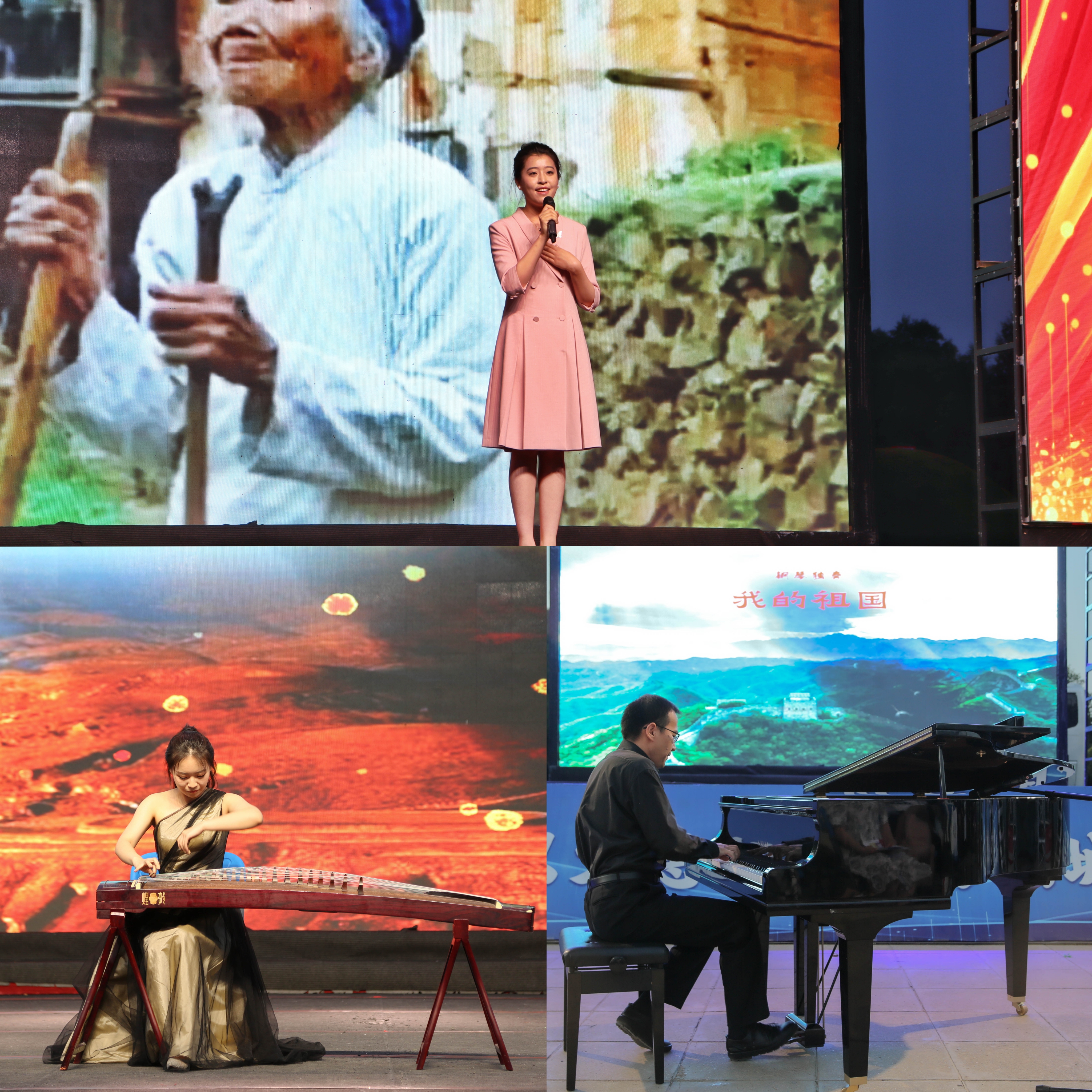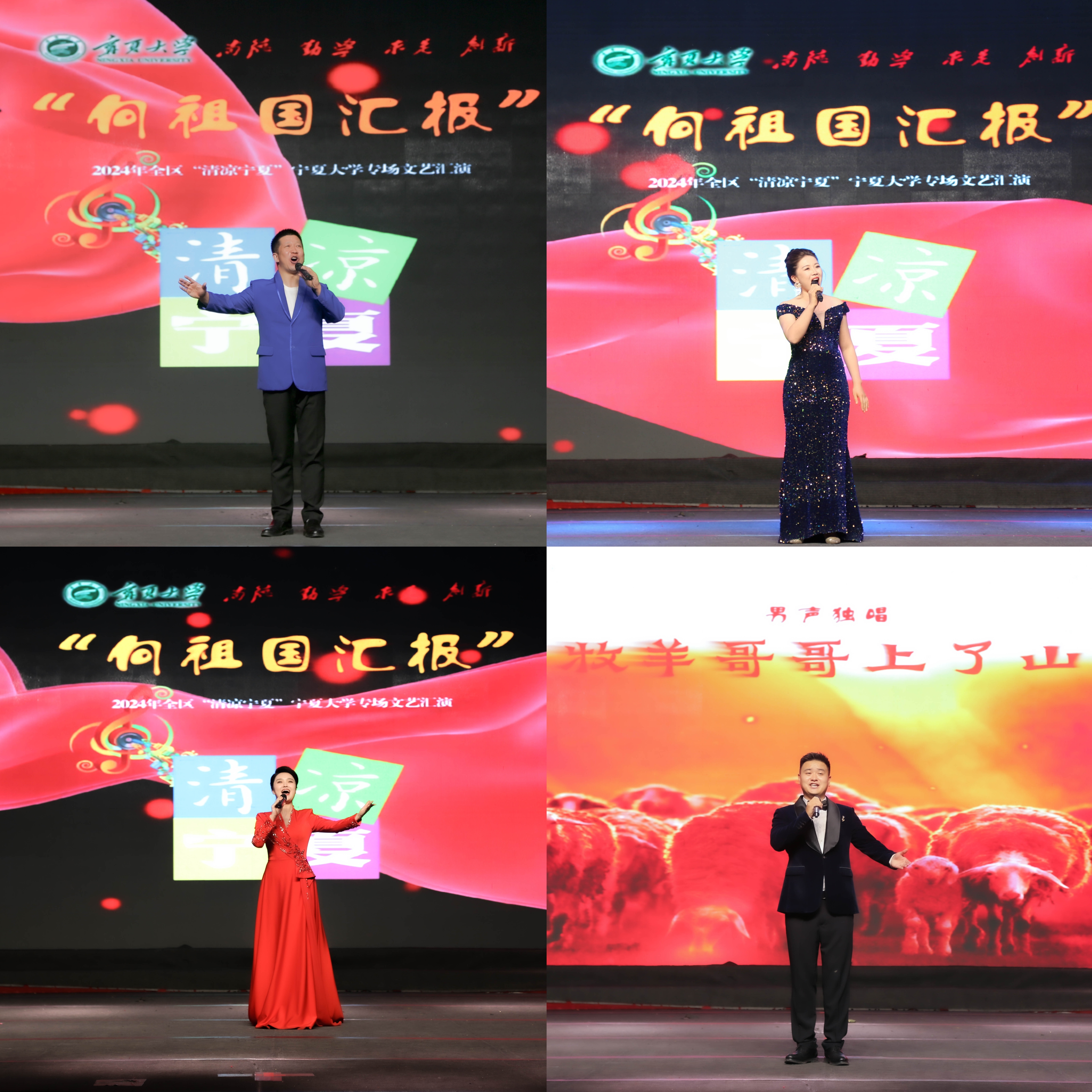 演出在荣获全区第七届大学生艺术展演一等奖的器乐组合《西夏王》的演绎中拉开帷幕。《西夏王》将宁夏地区花儿音乐元素重构运用,以节奏作为描述情绪的表现手段,层层递进、气势磅礴,铿锵有力、婉婉道来的乐器引领现场观众追求中华文化的源远流长。古筝独奏《望秦川》以古朴苍劲的陕西同州梆子为素材,蕴含着创作者对大学恩师的无限缅怀。钢琴独奏《我的祖国》、配乐诗朗诵《红土地上的爱情绝唱》让观众陶醉在器乐和朗诵带来的意境之美、想象之美和思维之美中。