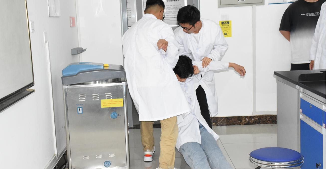 演练在格物楼424实验室开展,模拟了学生在用高压灭菌锅灭菌过程中发生高温蒸汽泄漏烫伤和人员触电事故,从事故发生、伤员救治到各部门应急响应并处置的全过程进行实操演练。整个演练过程紧张有序,有效检验了师生的应急处置能力。