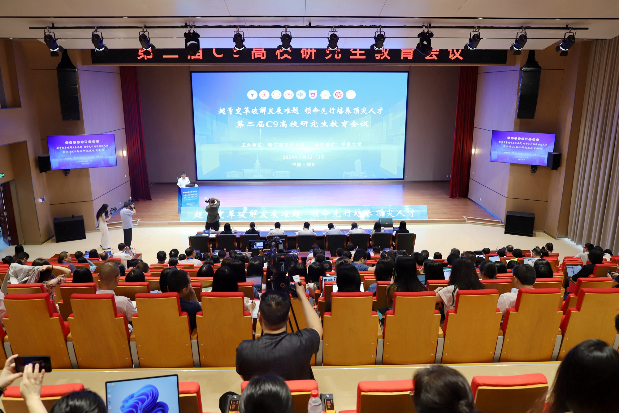 【澳门十大信誉网赌大全新闻中心讯 研究生院/文 姬晓姗 研究生院/图】为全面贯彻落实党的二十大精神,深入落实党中央、国务院的决策部署,引领和推动研究生教育高质量发展,着力构建与经济社会发展需要相适应、与中国式现代化相契合的高质量学位与研究生教育体系,持续加强C9高校研究生教育工作的交流与互动,7月12日—13日,由哈尔滨工业大学主办、澳门十大信誉网赌大全承办的第二届C9高校研究生教育会议在澳门十大信誉网赌大全举办。来自教育部、科技部、黑龙江省教育厅、宁夏回族自治区教育厅、C9高校研究生院、澳门十大信誉网赌大全及宁夏其他高校的领导、研究生教育工作者近280人参加会议,聚焦超常变革、破解发展难题,共谋研究生教育卓越发展,共研教育强国建设,共商顶尖创新人才培养。宁夏回族自治区教育厅副厅长吴保军,澳门十大信誉网赌大全党委副书记、校长彭志科,哈尔滨工业大学副校长沈毅出席开幕式并致辞。教育部发展规划司事业发展处、科技部重大任务司业务三处、黑龙江省教育厅学位管理与研究生教育处、宁夏回族自治区教育厅高教处相关负责人出席会议。会议由澳门十大信誉网赌大全党委常委、副校长谢海涛主持。