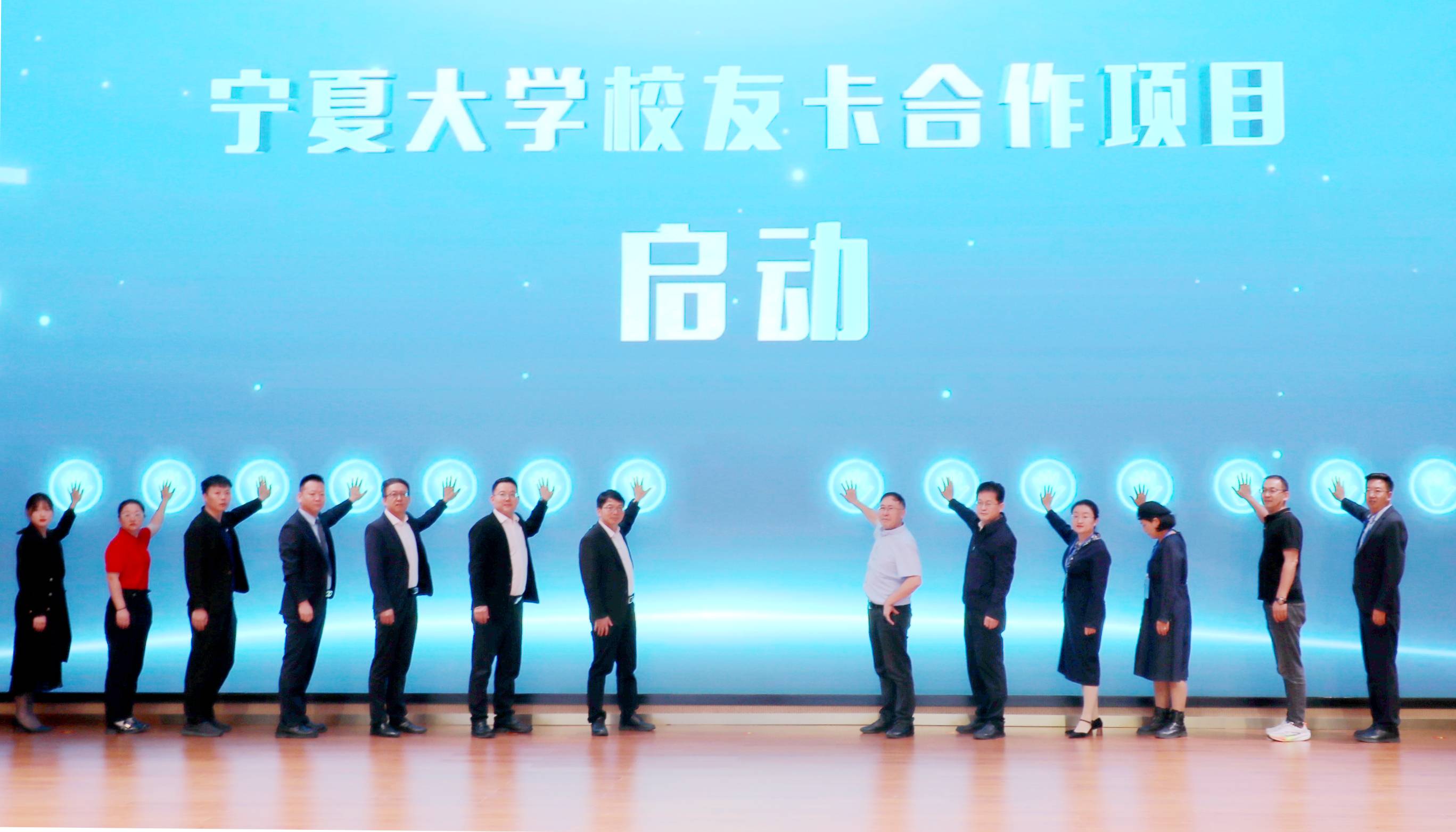 启动仪式上,彭志科、谢应忠、校友卡合作企业代表共同上台启动校友卡合作项目。