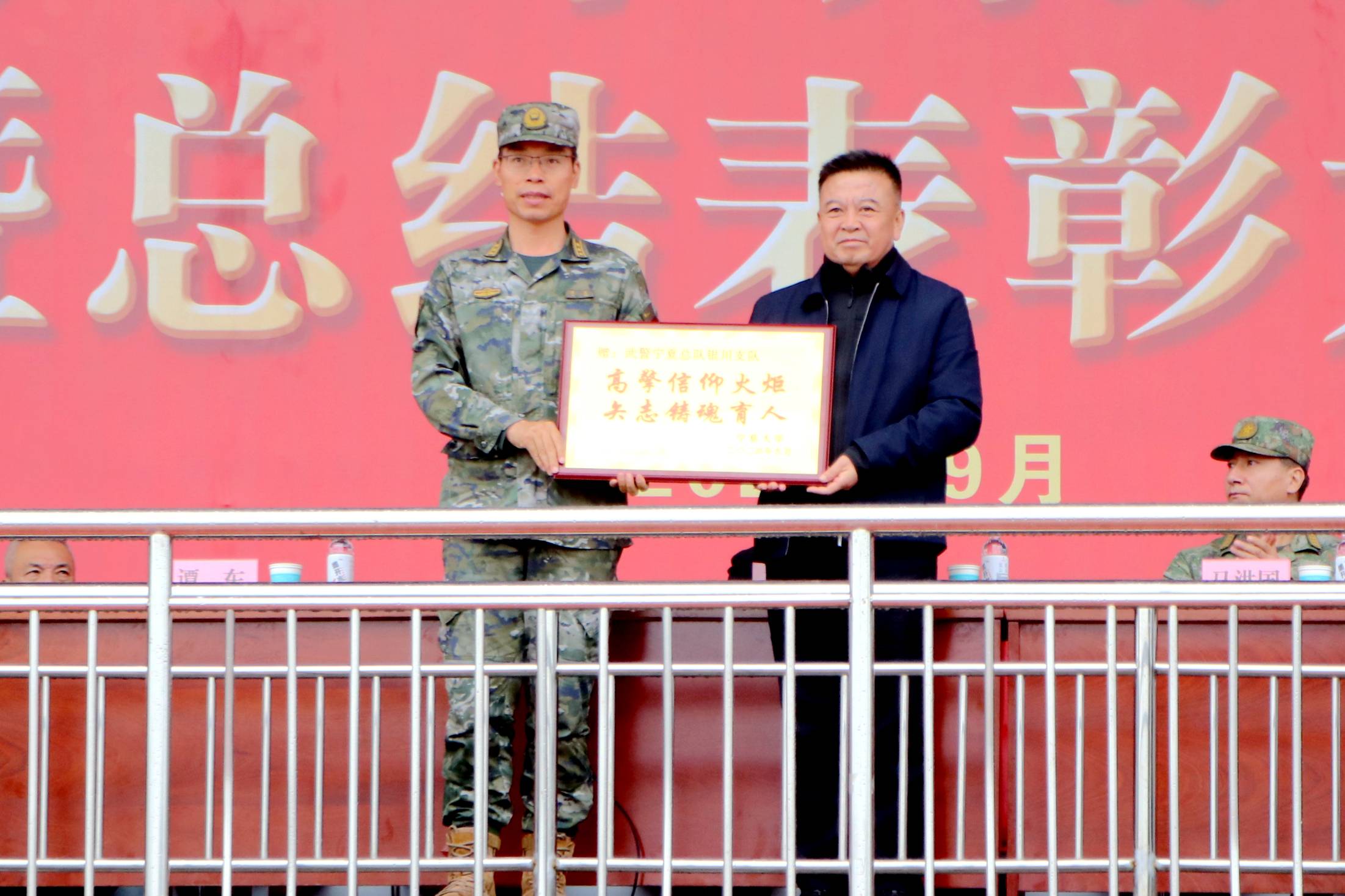校党委副书记张桓为承训部队授奖牌。