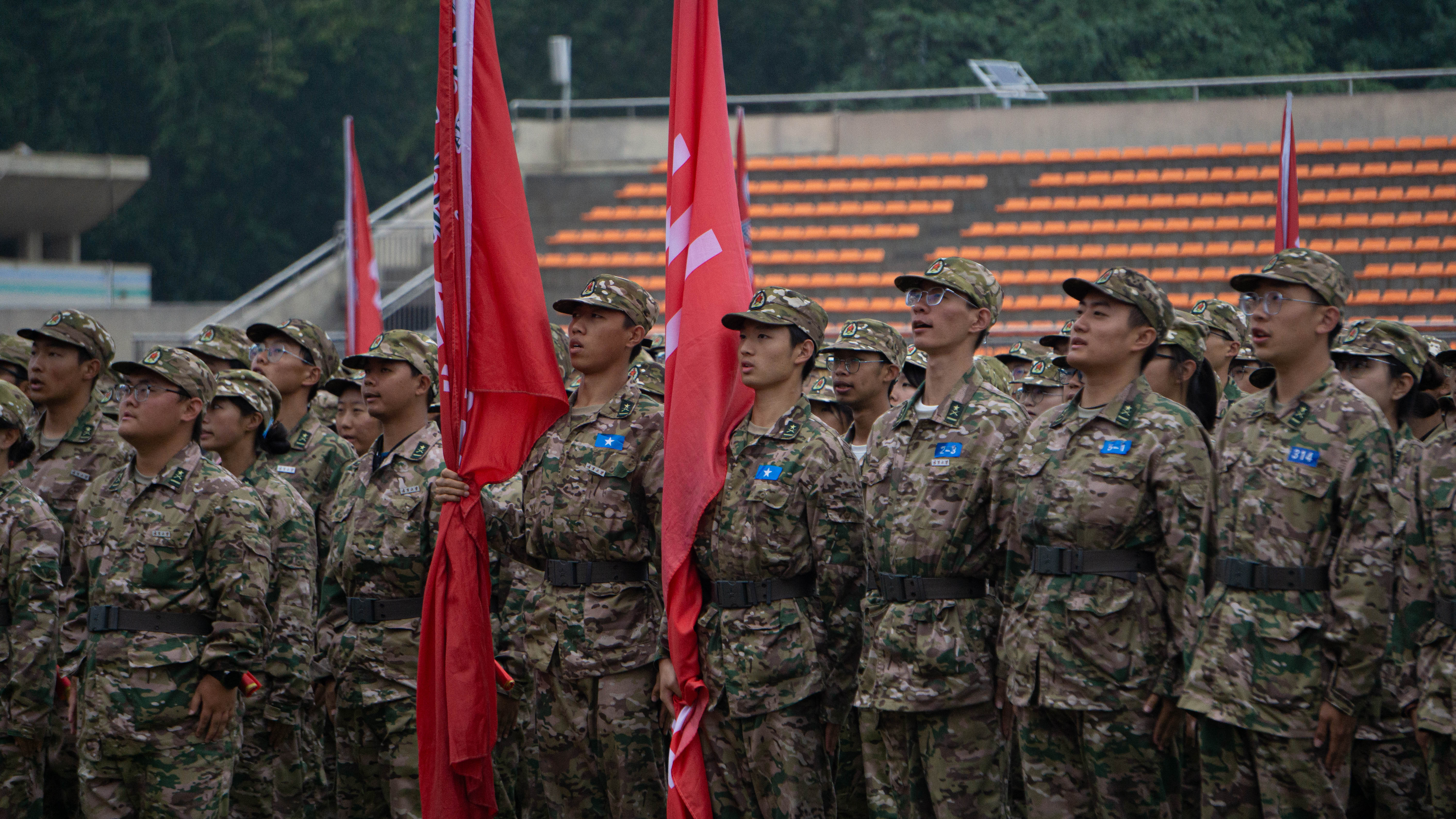 7个营的方队闻令而动,在各营旗的指引下迈着整齐划一的步伐、喊着响彻云霄的口号、挺着矫健刚强的身姿沿田径场跑道依次走过观礼台进行庄严的分列式汇报,满怀斗志与豪情接受军训成果的检验。