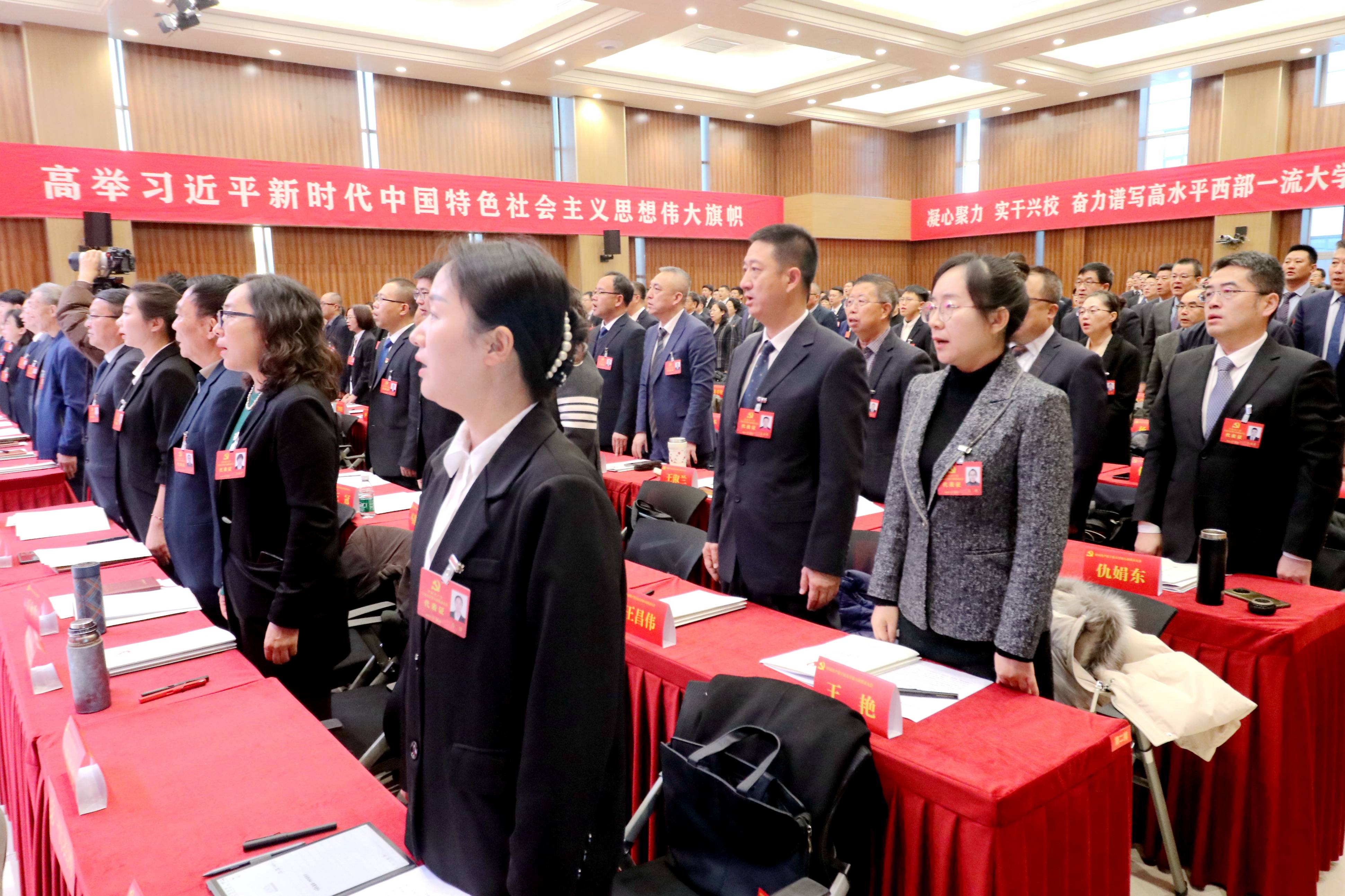 大会会场气氛庄重热烈。主席台上由镰刀和锤头组成金色党徽悬挂正中,10面鲜艳的红旗分列两侧,“中国共产党澳门十大信誉网赌大全第八次代表大会”的会标格外醒目。会场后方悬挂的“凝心聚力 实干兴校 奋力谱写高水平西部一流大学建设新篇章”等标语鼓舞人心、催人奋进。