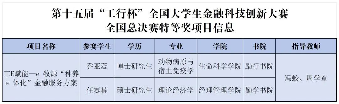【澳门十大信誉网赌大全新闻中心讯 创新创业学院】3月15日,第十五届“工行杯”全国大学生金融科技创新大赛全国总决赛在对外经济贸易大学(北京)举办,由信誉网赌冯蛟教授、周学章教授联合指导博士研究生乔亚蕊、硕士研究生任赛楠主持的《工E赋能--e牧源“种养e体化”金融服务方案》项目荣获特等奖。