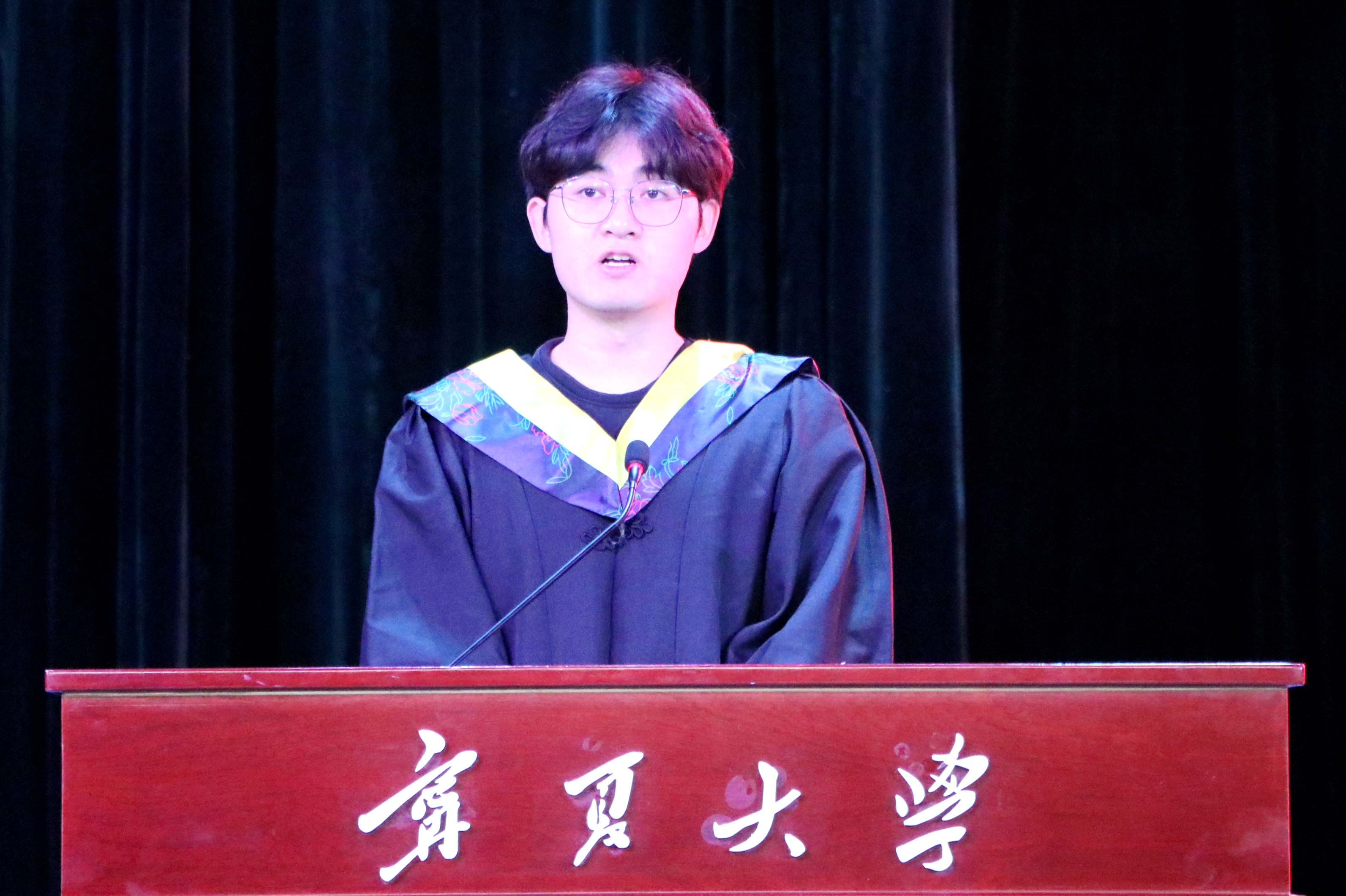 毕业生代表、土木与水利工程学院(励行书院)2021级土木工程专业本科生谢宇涛同学回忆起四年前初入澳门十大信誉网赌大全,站在校训石前的情景,他与同学们分享了上课时老师推导公式、图书馆里阿姨送热茶、操场上晨跑和校运会的拼搏等青春记忆中体现着“勤学”“求是”和“沙枣树精神”的场景,并希望所有毕业生像沙枣树一样,无论在哪里扎根奋斗,都能枝叶向上,在祖国的大好河山中结出属于自己的丰硕果实。