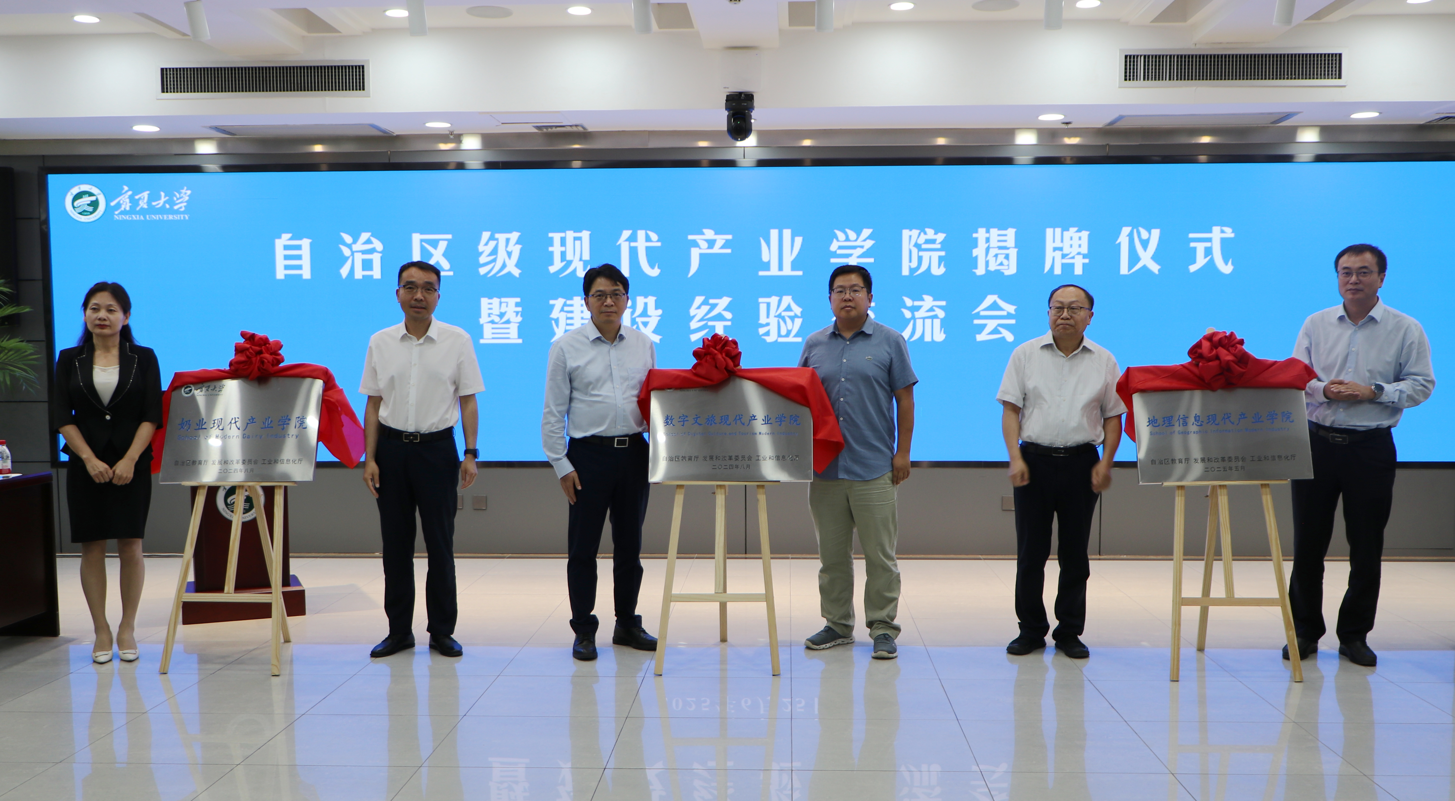 交流会前,与会领导为奶业现代产业学院、数字文旅现代产业学院、地理信息现代产业学院、现代煤化工产业学院、云计算大数据现代产业学院、智能制造现代产业学院6个自治区级(重点培育)现代产业学院揭牌。