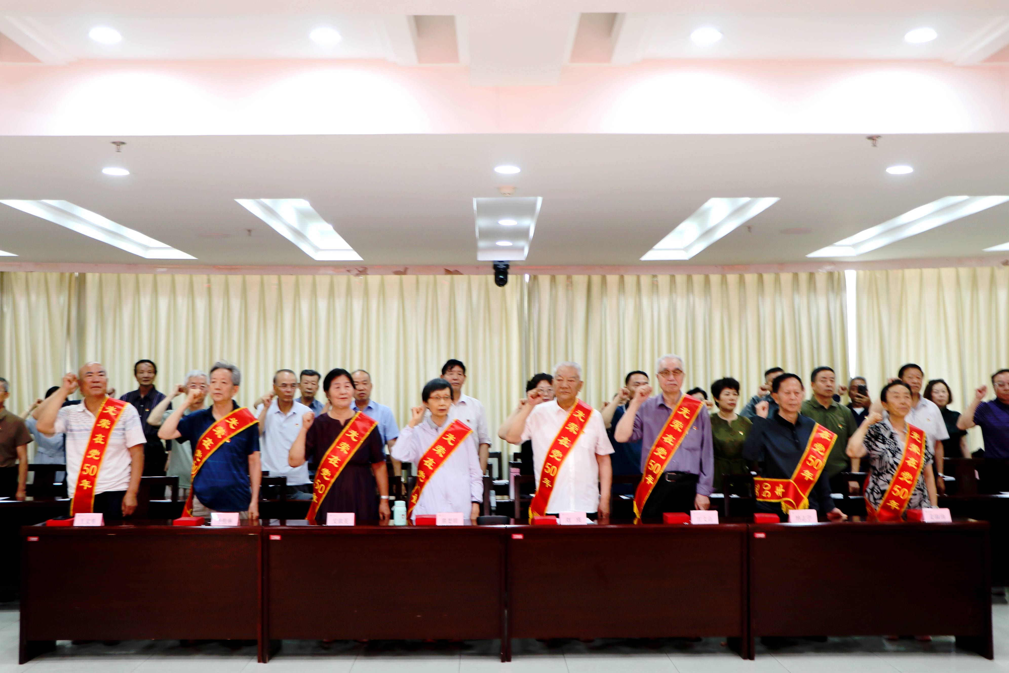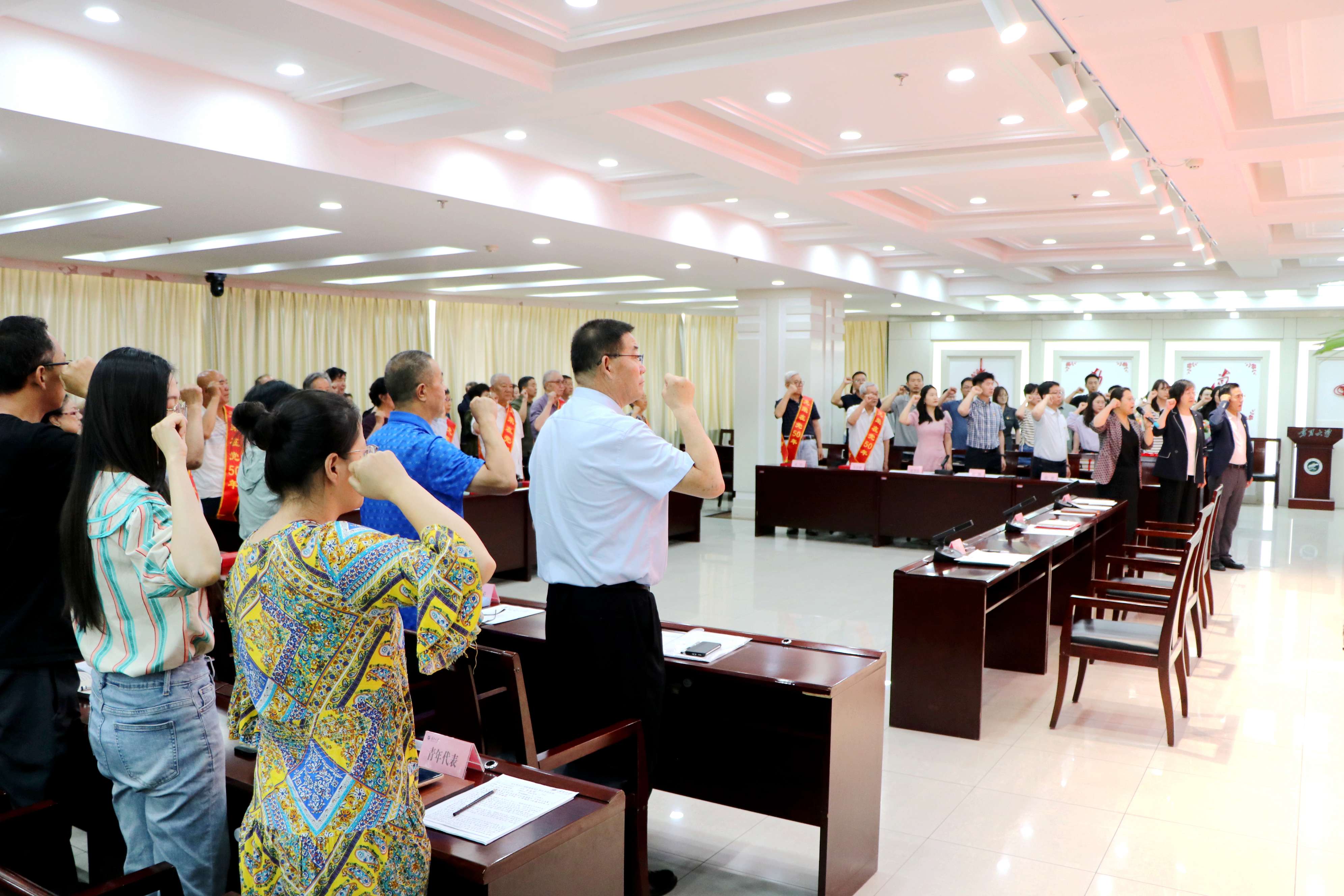 “我志愿加入中国共产党,拥护党的纲领......”会议伊始,与会人员高举右拳,齐声重温入党誓词。校党委常委、宣传部部长高永兴宣读荣获“光荣在党50年”纪念章老党员名单。