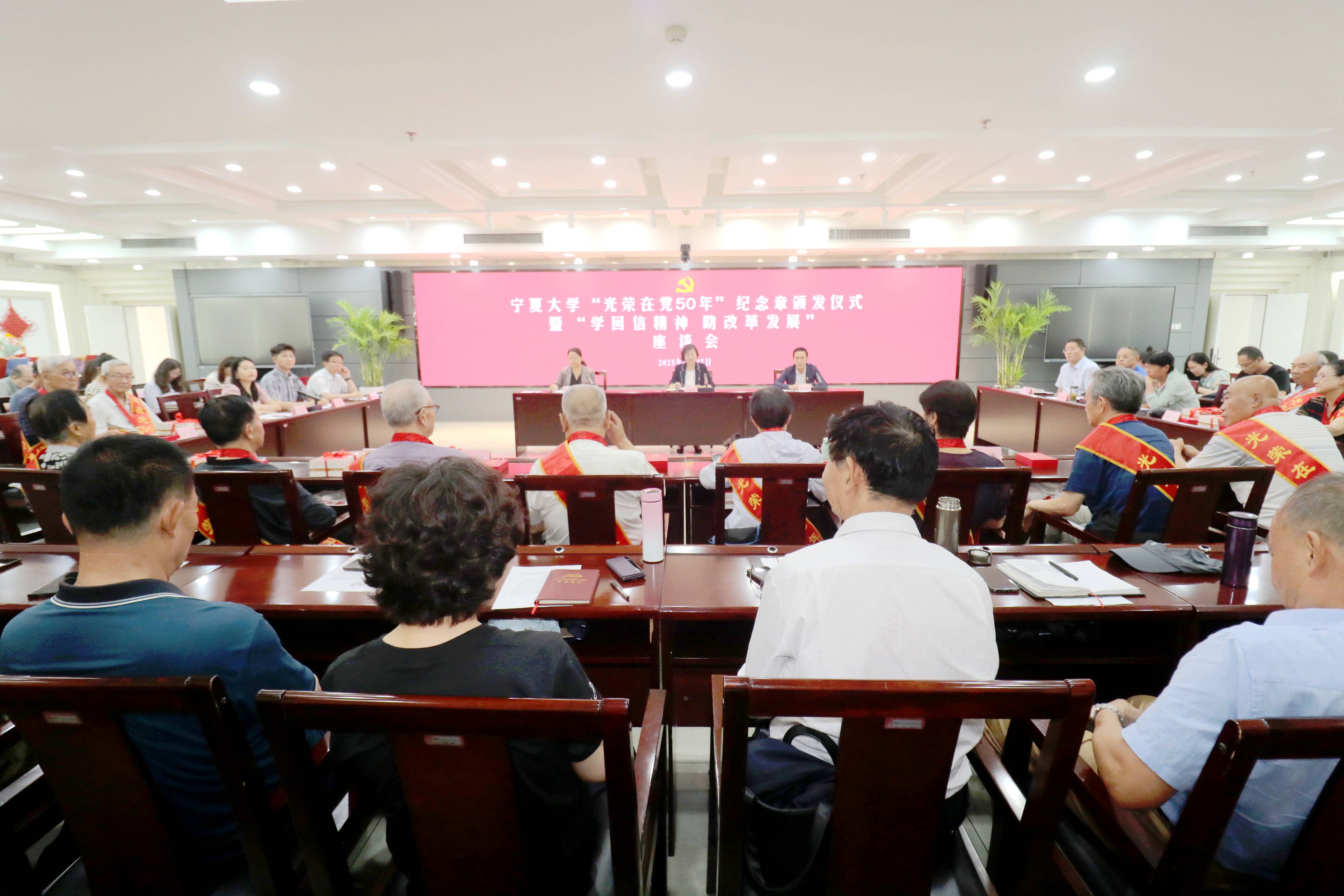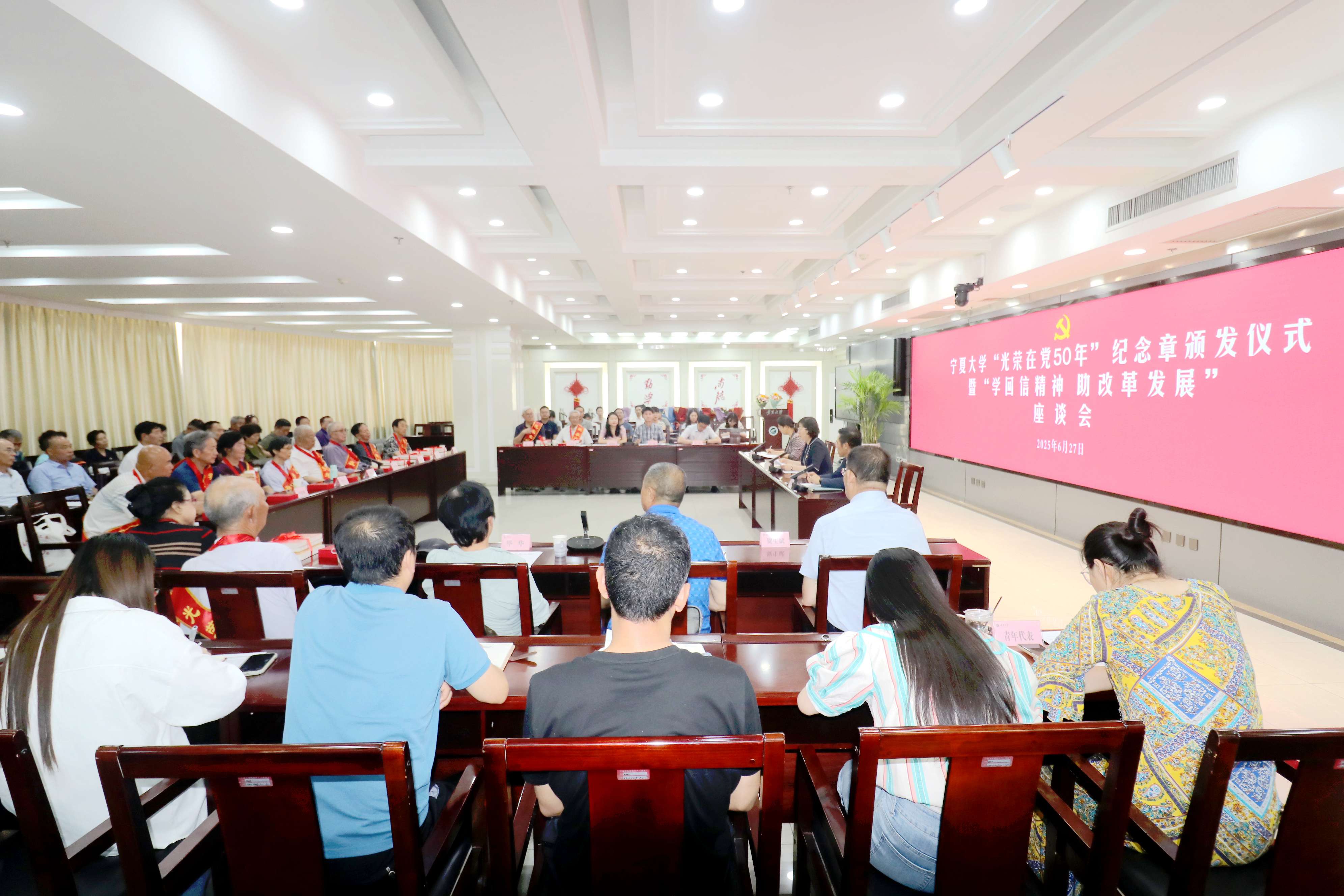 离退休人员服务处党委委员,“光荣在党50年”纪念章获得者,各离退休干部职工党支部书记,青年教职工党员代表等参加座谈会。