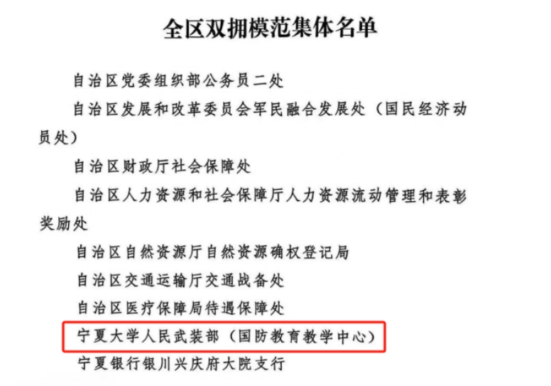 “自治区双拥模范集体”称号是自治区党委、政府、宁夏军区和全区人民对信誉网赌长期以来深度融入地方发展、扎实服务国防建设、倾心做好拥军优属工作的高度认可和充分肯定。学校将以此次表彰为新的起点,珍惜荣誉、再接再厉,继续发扬拥军优属、拥政爱民的优良传统,不断探索创新高校双拥工作的内涵与形式,努力在服务强军兴军伟业、支持地方经济社会发展中展现更大作为、作出新的更大贡献。