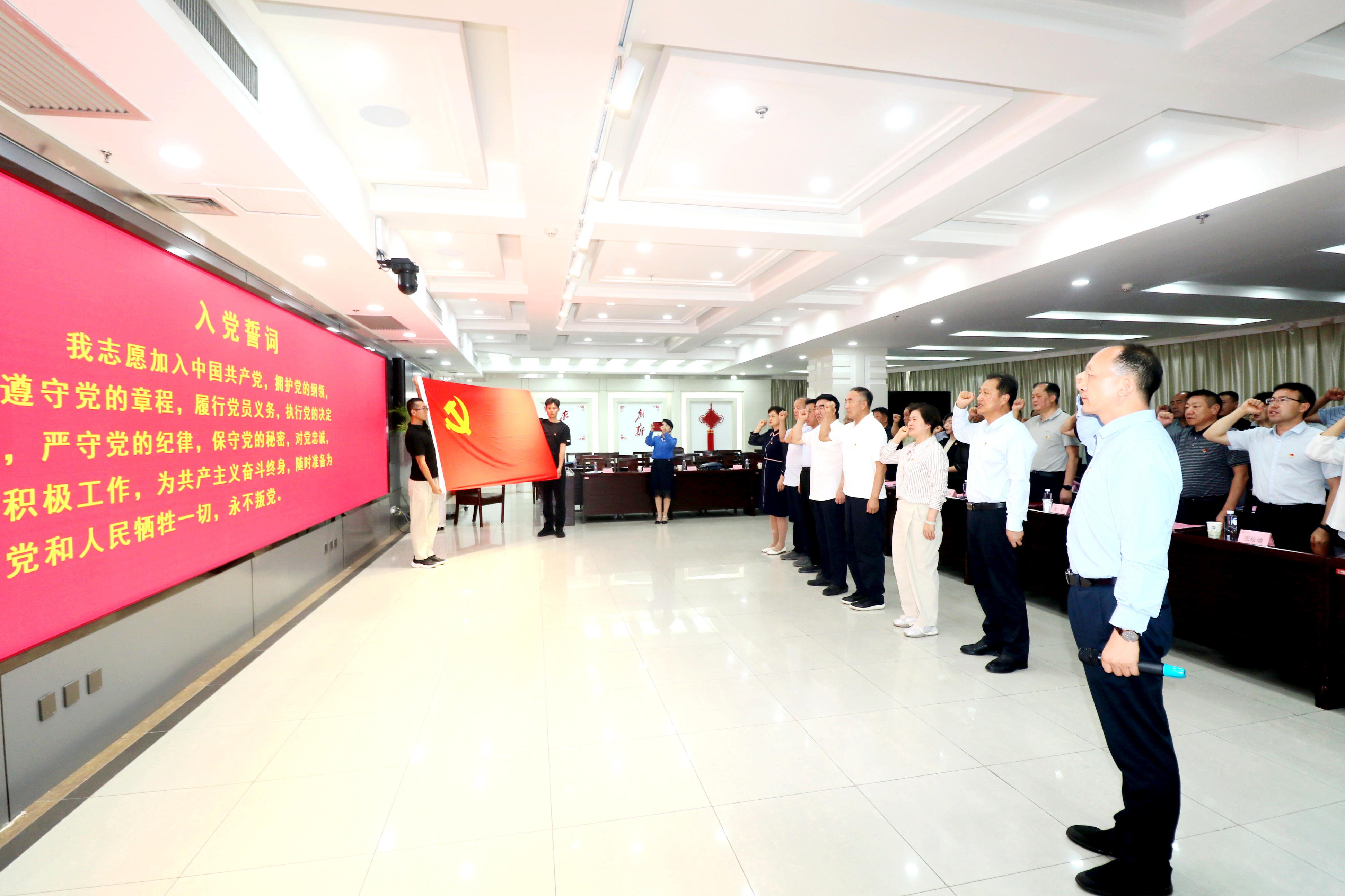 “我志愿加入中国共产党,拥护党的纲领,遵守党的章程……”活动最后,全体党员移步会场中心,举起右拳,在领誓人的带领下庄严重温入党誓词。
