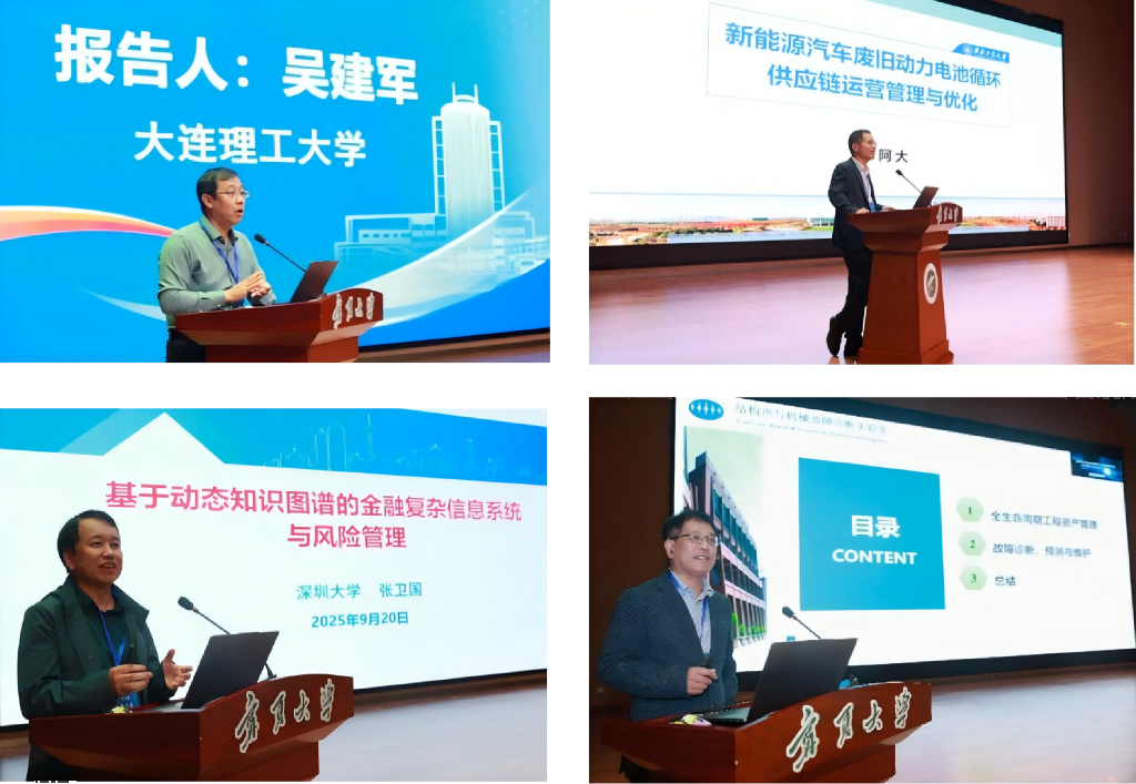 会议期间,基金委管理科学部刘作仪研究员、大连理工大学吴建军教授、西北工业大学车阿大教授、深圳大学张卫国教授、青岛理工大学林天然教授、天津大学王鑫教授、清华大学岳小伟副教授、上海大学翟庆庆副教授、澳门十大信誉网赌大全赵军教授分别就基金委管理科学部的资助动态、低空运行管理、废旧动力电池循环供应链运营管理、金融复杂信息系统与风险管理、机械装备健康监测诊断与工程资产管理、知识图谱新技术、飞机质量工程、可靠性数据建模分析、大模型驱动的企业演化计算实验等领域分享了前沿科研成果。