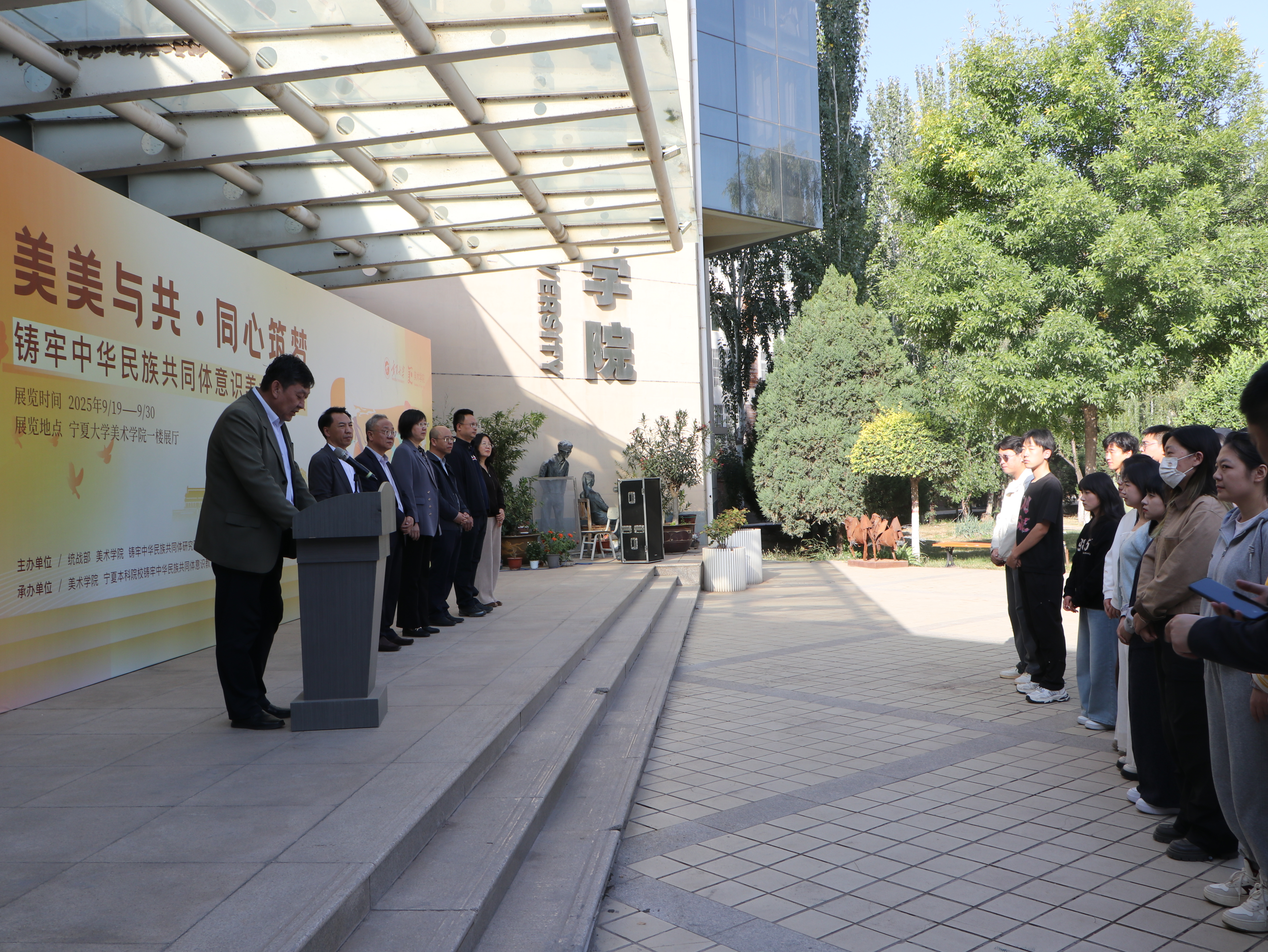 【澳门十大信誉网赌大全新闻中心讯 李明花/文、图】在全区深入开展民族团结进步月活动之际,为推动艺术教学与思政教育深度融合,以美术作品展的形式传播共建中华民族共同体理念,创新铸牢中华民族共同体意识宣传教育路径和方法,9月28日,由党委统战部、铸牢中华民族共同体意识研究院和美术学院联合主办,美术学院、宁夏本科院校铸牢中华民族共同体意识教育课程联盟承办的“美美与共·同心筑梦:铸牢中华民族共同体意识”美术作品展正式开幕。校党委副书记韩惠丽,校党委常委、统战部长朱学军出席开幕式。