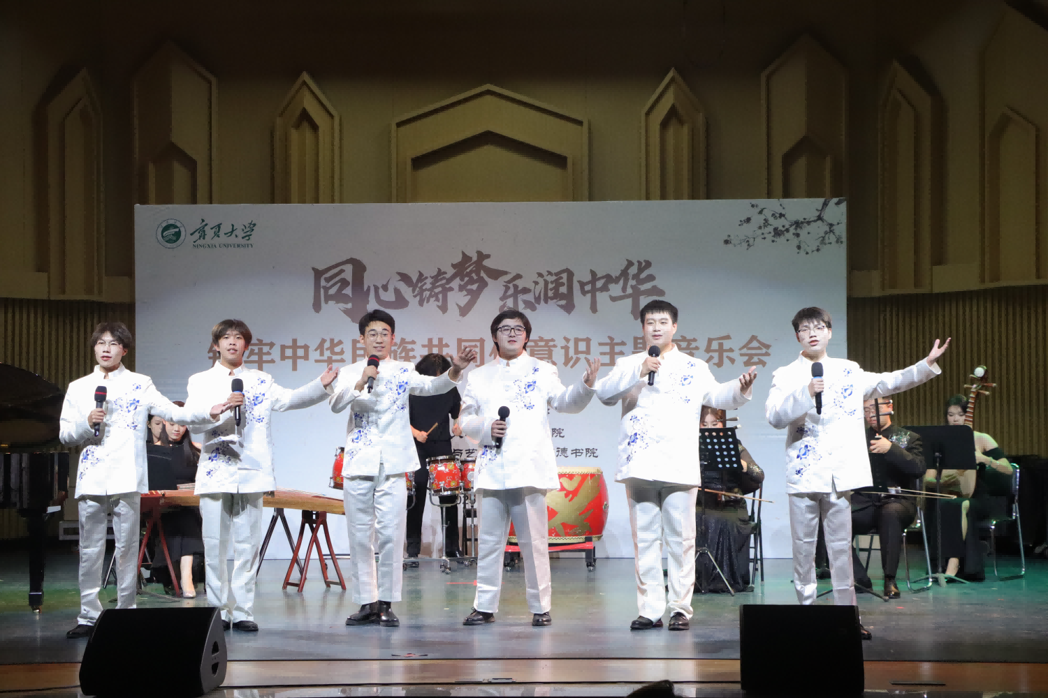 音乐会在一曲洋溢着民族团结氛围的民族器乐合奏中拉开序幕。上半场以“华夏国风,丝竹和鸣”为主题,集中呈现了我国各民族丰富多彩的音乐文化。从西南地区的《太阳出来喜洋洋》到江南水乡的《茉莉花》,从湘西民歌《马桑树儿搭灯台》到山西民歌《走西口》,同学们以真挚的情感与精湛的表演,生动诠释了“五个共同”的深刻内涵。下半场“梨园精粹,塞上高歌”将现场气氛推向高潮。戏曲联唱《苏三起解》《刘海砍樵》展现了中华戏曲的独特韵味,而宁夏本土“花儿”《妹妹的山丹花开》《眼泪花花把心淹了》等节目,则以高亢悠扬的唱腔、质朴深情的演绎,生动呈现了“休戚与共、荣辱与共、生死与共、命运与共”的中华民族共同体理念。这些由多民族共同传承的非物质文化遗产,成为各民族交往交流交融的鲜活见证。