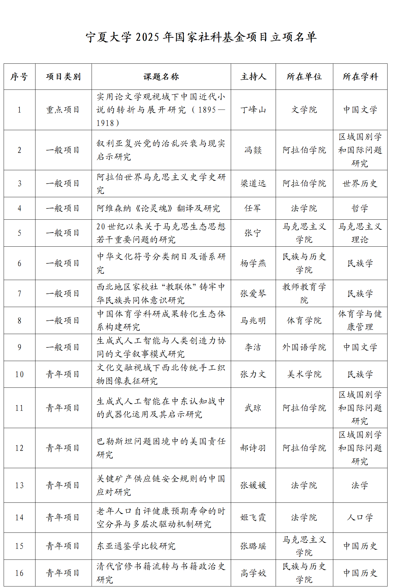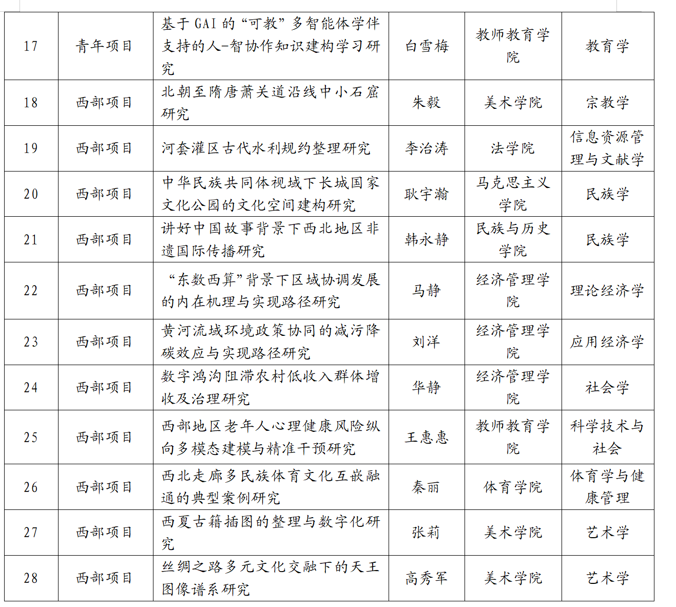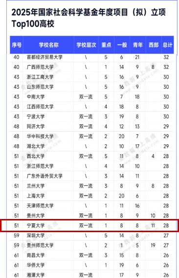 【澳门十大信誉网赌大全新闻中心讯 人文社会科学处】近日,2025年国家社科基金教育学、艺术学和年度项目立项结果先后正式公布,信誉网赌共有28个项目获得立项资助(其中重点项目1项、一般项目8项、青年项目8项、西部项目11项),立项数创“十四五”期间信誉网赌国家社科基金项目立项最好成绩。2025年度信誉网赌国家社科基金立项数在全区位居第1名(约占全区立项总数的55%),在Z14高校中位居第4名,在全国高校中位居第51名。目前,仍有部分国家社科基金项目(如冷门绝学研究专项、高校思想政治理论课研究专项、后期资助项目等)正在组织申报或评审中。