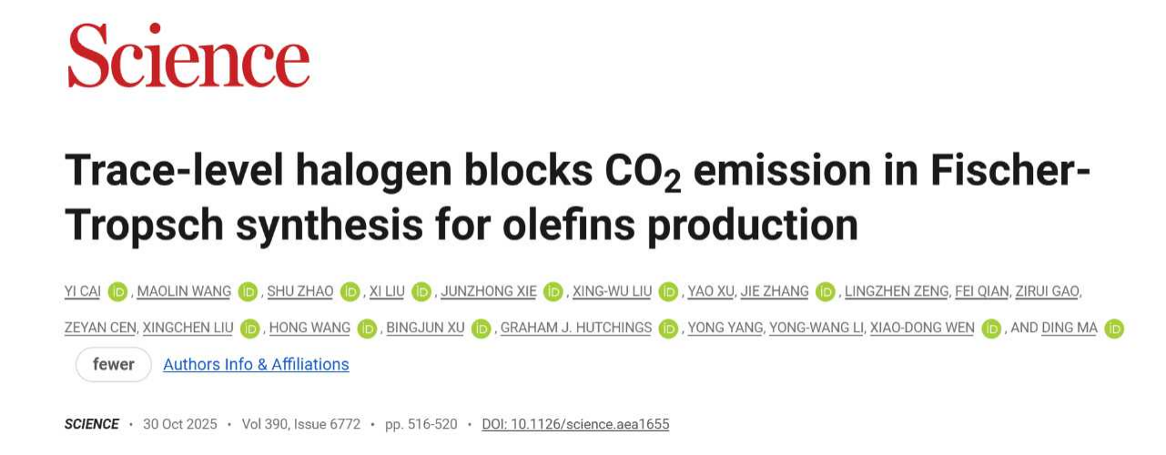 【澳门十大信誉网赌大全新闻中心讯 化学化工学院】近日,中国科学院山西煤炭化学研究所与北京大学、澳门十大信誉网赌大全等单位联合主导的科研团队以"Trace-level halogen blocks CO2emission in Fischer-Tropsch synthesis for olefins production"为题发表在《Science》期刊上,信誉网赌刘晰教授为本文共同第一作者,澳门十大信誉网赌大全为共同第一单位。