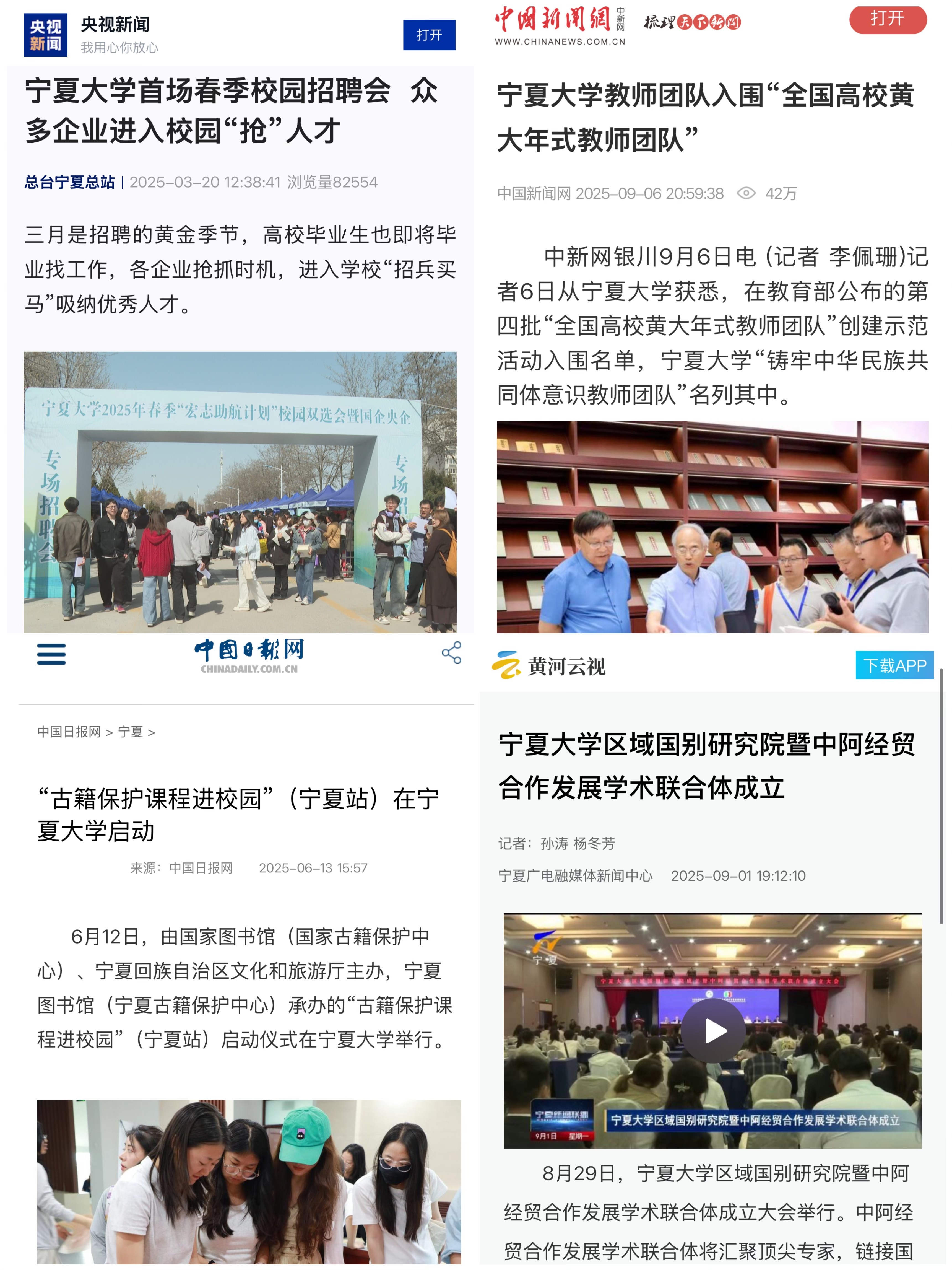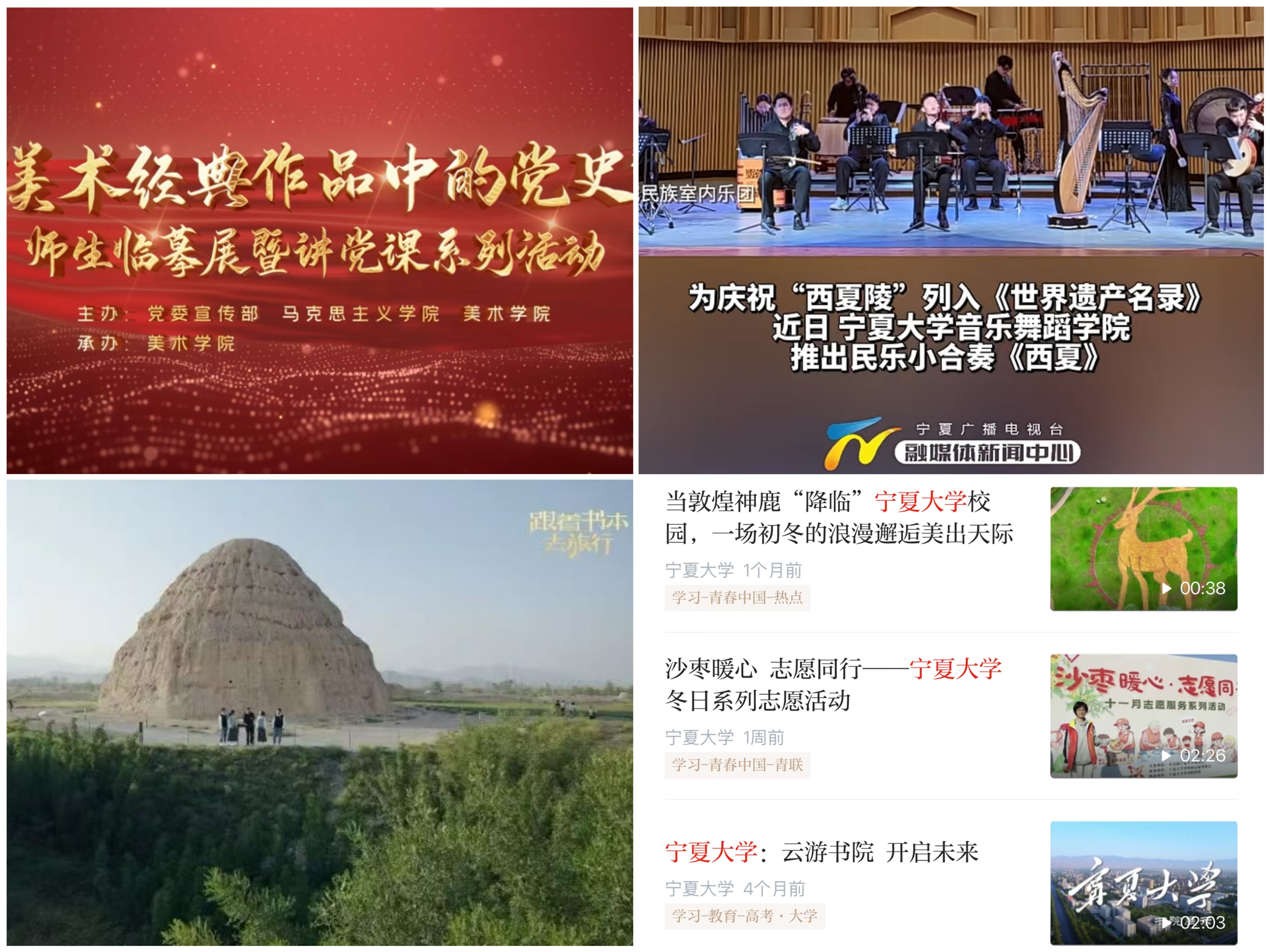 文化传承创新亮点纷呈,原创史诗舞台剧《沙枣树· 路与梦》以历史叙事展现澳门十大信誉网赌大全在时代浪潮中的发展历程,生动诠释宁大人“不怕困难,不畏风寒;根深叶茂,本固枝荣”的精神底色;原创歌剧《山河同路》以跨时空青春对话的具象化视角将“行走的思政课”隽永呈现,让红色血脉接续流传。“艺术+思政”育人模式推陈出新,60幅党史主题画作将百年风华浓缩于方寸之间,“音乐党课”用“讲唱演”和“视听悟”的沉浸式学习直抵人心。从《跟着书本去旅行》的沉浸式文化体验、纪录片《石榴花开》的生动写照,到西夏陵海外宣传片的国际传播,一系列有分量、有温度的外宣活动,向全社会展示宁大故事。“贺兰山论坛”星光熠熠,神舟十六号航天员桂海潮,中国科学院院士张继平、郑志明,北京大学翟崑和清华大学达巍、吴大辉等顶尖专家学者的智慧分享,为师生打开仰望星空的窗口。线上线下,育人润心,澳门十大信誉网赌大全将宣传思想文化工作转化为内涵式发展的动能,在守正创新中谱写育人新篇。