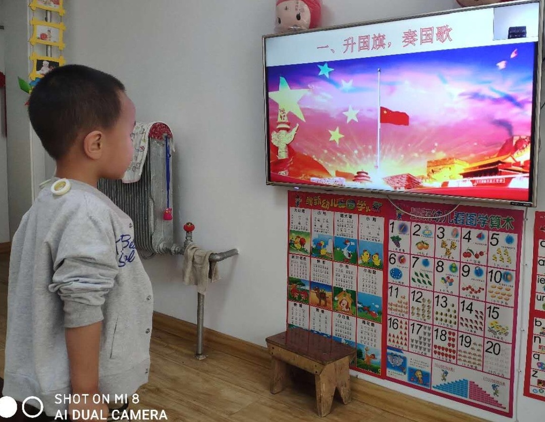 伴随着庄严的国歌声,全体教师和小朋友举行线上升旗仪式,鲜艳夺目的五星红旗映照着一张张认真严肃的小脸,在孩子们幼小的心中种下爱祖国、爱家乡的种子。