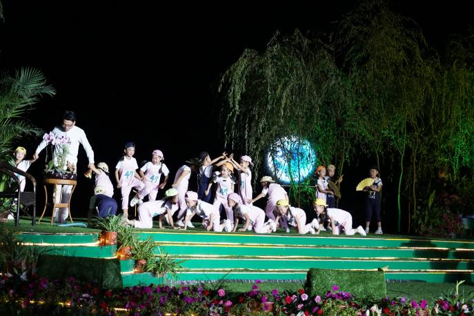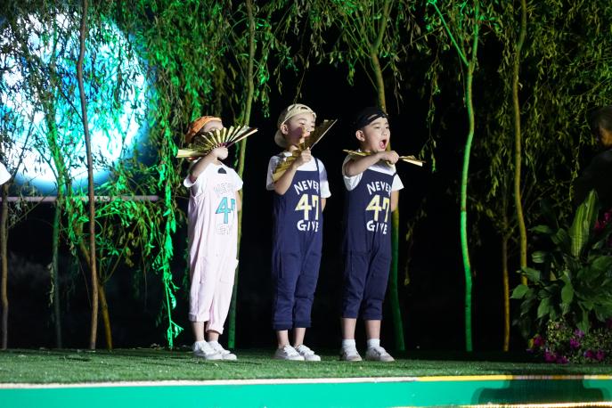 本次诗会共五个篇章。作为开篇的“古韵生香”第一幕的《带着孩子,跟着诗词去旅行》不仅是开场第一个节目,更是朗诵诗词最多、朗诵者年龄最小的节目。身穿粉红色的背带裤,头戴黄色的贝雷帽,孩子们蹦蹦跳跳的样子为诗会带来了青春的活力。来自幼儿园的他们用稚嫩的声音、饱满的感情跟随着配乐朗诵表演了十多首古诗词,赢得了现场观众的热烈掌声。