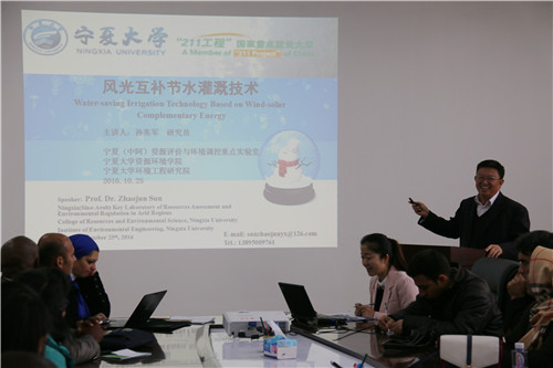 重点实验室主任、资源环境学院兼环境工程研究院院长孙兆军研究员向到访人员介绍了实验室近年来在旱区节水灌溉领域的工作进展,并重点介绍了自主研发的节水管道的技术优势以及风光互补节水灌溉系统在阿曼、阿联酋迪拜等国的应用情况。