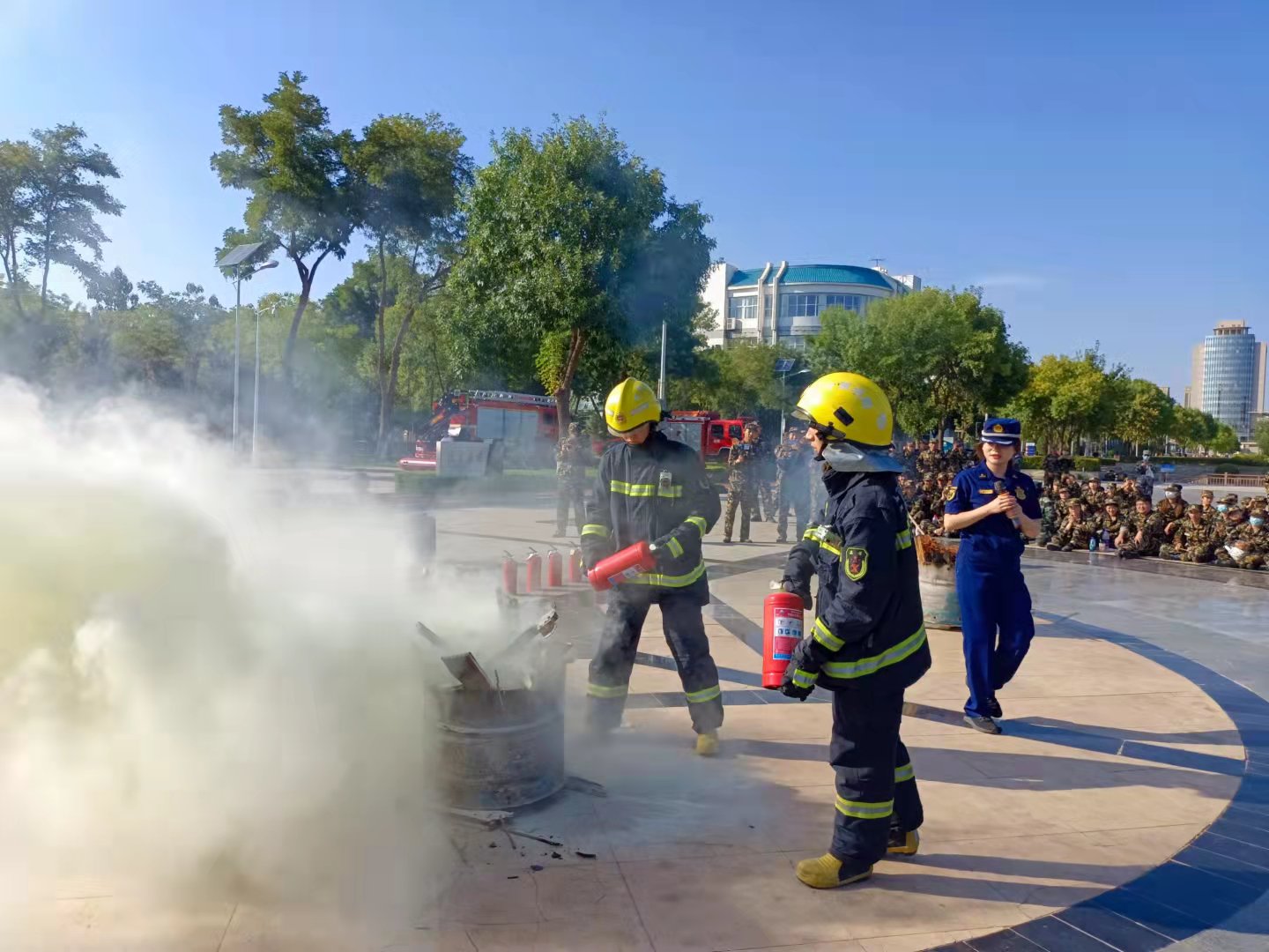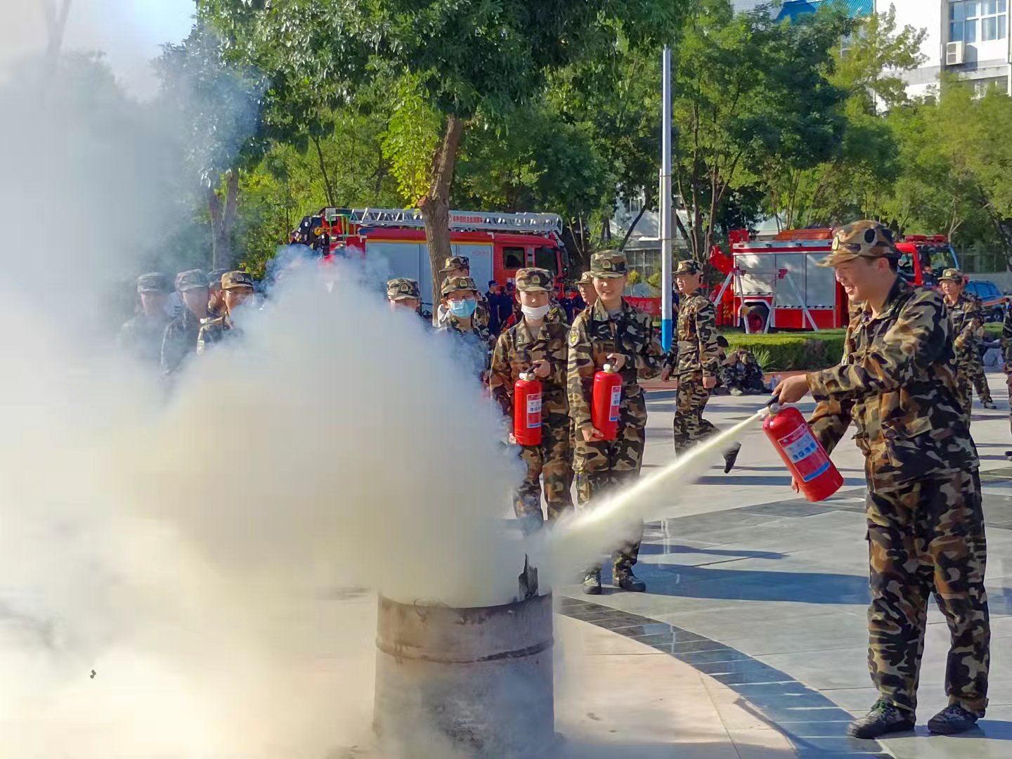 演练开始前,西夏区消防救援大队高一博参谋结合新生实际,重点讲解了火灾警示案例、校园重点区域防火知识以及如何拨打119报警电话。在灭火器实际操作过程中,高一博结合实物讲解并组织指战员示范灭火器的使用方法,随后指导新生如何利用灭火器实施灭火。