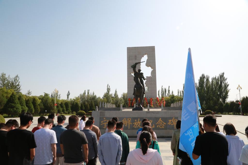 金秋的宁夏解放广场公园庄严肃静。全体党员肃穆而立,学生党员代表王海榆和闫安朝向革命烈士敬献花篮,大家排着整齐的队伍,肃立在解放纪念碑前,向革命烈士默哀,致敬人民英雄。随后,全体党员面向党旗,举起右拳置于耳畔,重温入党誓词,感悟革命先烈们为了争取民族独立、人民幸福、国家富强,迎难而上、不怕牺牲的奉献精神。