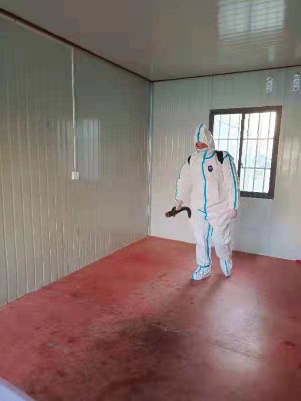 消杀工作人员按要求做好隔离室的消毒工作。对隔离室地面、门窗、桌椅、门把手等部位使用含氯消毒液进行喷洒消毒。消毒完30分钟后打开门窗通风。