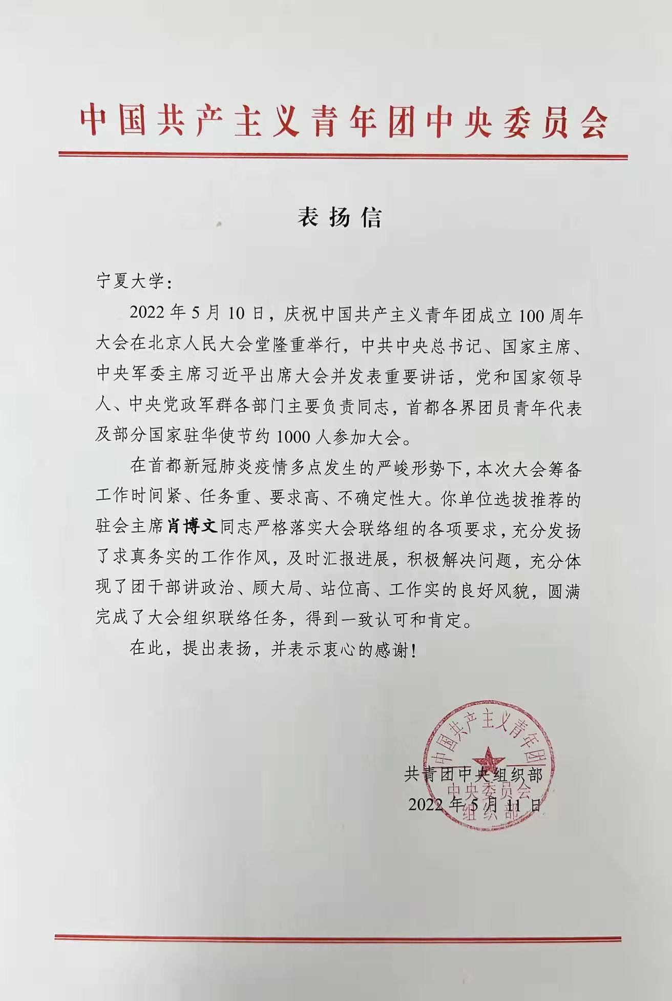 【澳门十大信誉网赌大全新闻中心讯 校团委】近日,校团委收到共青团中央组织部发来的一封表扬信。表扬信中感谢信誉网赌推荐的驻会主席肖博文同学在庆祝中国共产主义青年团成立100周年大会上严格落实大会联络组的各项要求,充分发扬了求真务实的工作作风,及时汇报进展,积极解决问题,充分体现了团干部讲政治、顾大局、站位高、工作实的良好风貌,圆满完成了大会组织联络任务。