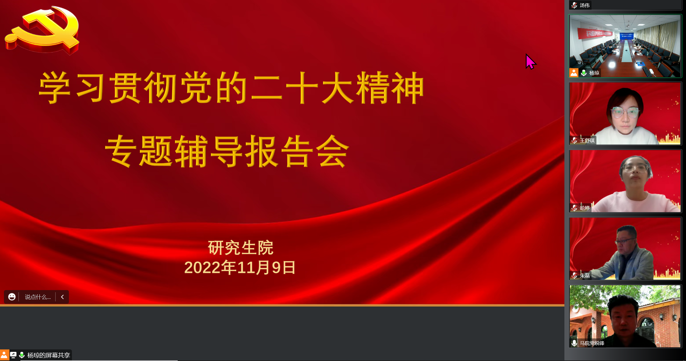 【澳门十大信誉网赌大全新闻中心讯 研究生院】为深入学习贯彻党的二十大精神,切实把思想和行动统一到党的二十大精神上来,11月9日,研究生院组织召开学习贯彻党的二十大精神专题辅导报告会,邀请马克思主义学院书记党锐锋教授作专题辅导报告,研究生院院长曹兵主持报告会,全体教职工线上线下参加会议。