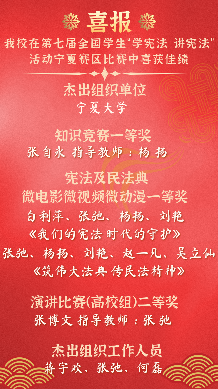 【澳门十大信誉网赌大全新闻中心讯 团委】近日,由自治区教育厅举办的第七届全国学生“学宪法 讲宪法”活动宁夏赛区获奖名单公布,澳门十大信誉网赌大全荣获“杰出组织单位”荣誉称号,由杨扬老师指导的2020级法学专业本科生张自永获知识竞赛一等奖,白利萍、张弛、杨扬、刘艳的作品《我们的宪法时代的守护》和张弛、杨扬、刘艳、赵一凡、吴立仙的作品《筑伟大法典传民法精神》获微电影微视频微动漫比赛一等奖,由张弛老师指导的2020级法学专业本科生张博文获演讲比赛(高校组)二等奖,信誉网赌教师蒋宇欢、张弛、何磊老师荣获“杰出组织工作人员”荣誉称号。