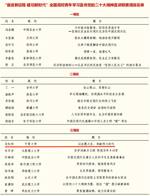 【澳门十大信誉网赌大全新闻中心讯 校团委】近日,由清华大学举办的“奋力新征程 建功新时代”全国高校青年学习宣传贯彻党的二十大精神宣讲联赛获奖名单公布,信誉网赌“宁育菁华”青年宣讲团成员、马克思主义学院研究生马红玲所作“以志愿之名,奉献伟大时代”的主题宣讲喜获三等奖。